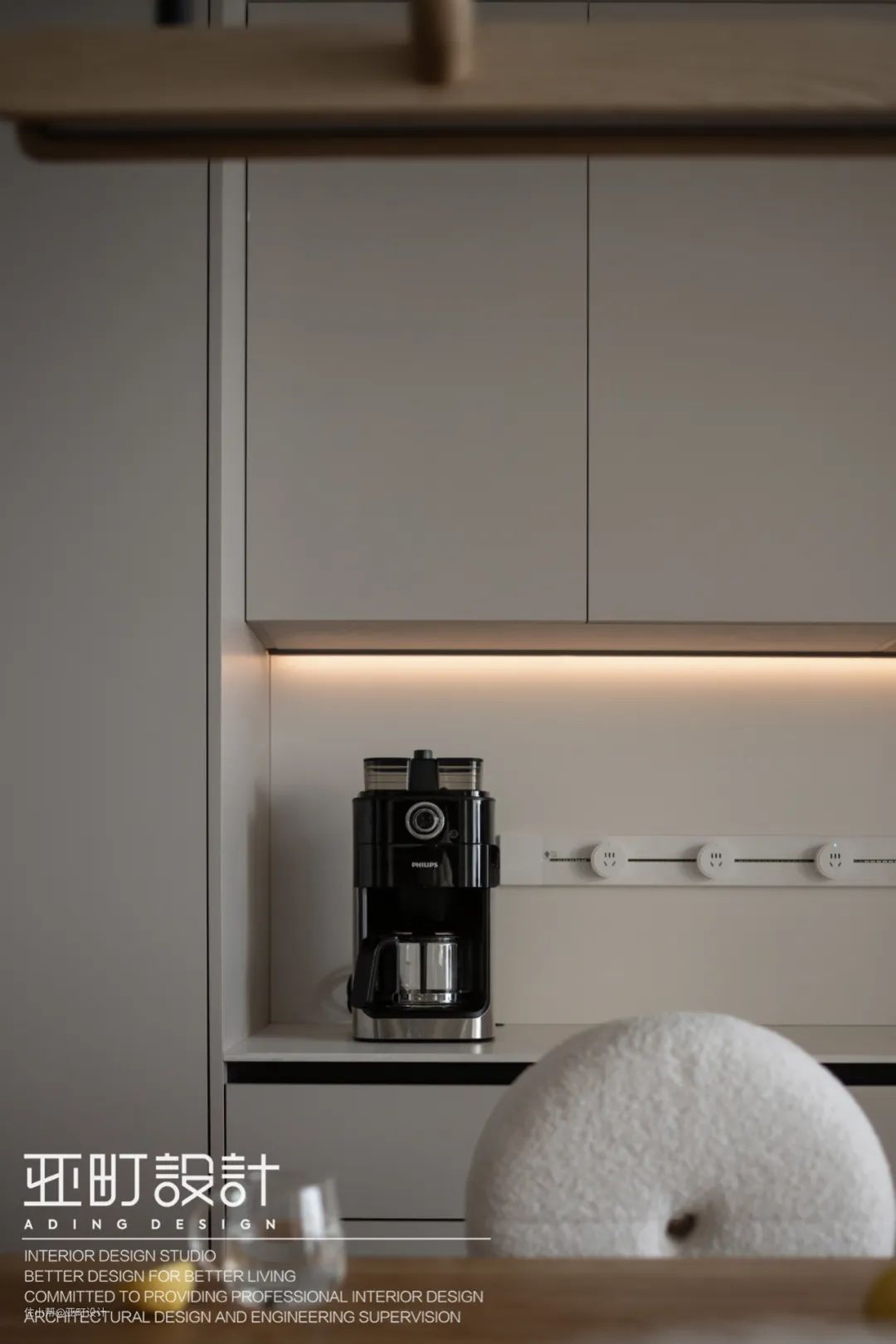 白色弧形背景墙藏匿暖色灯带,等到夜幕降临,也能沉浸式享受奶油风带来的温馨氛围。
