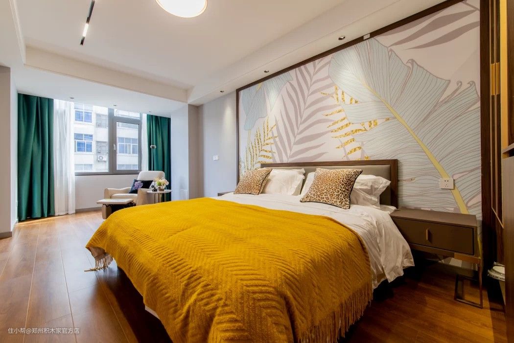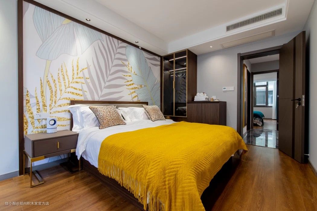 实木地板是打造卧室轻奢雅致的另一个重要元素。实木地板给人一种自然、温暖和高贵的感觉,它的质感和纹理能够为整个卧室增添一份独特的韵味。选择一个色调温和的实木地板,与黄色床品和背景墙相互呼应,可以创造出一种舒适、优雅的氛围。