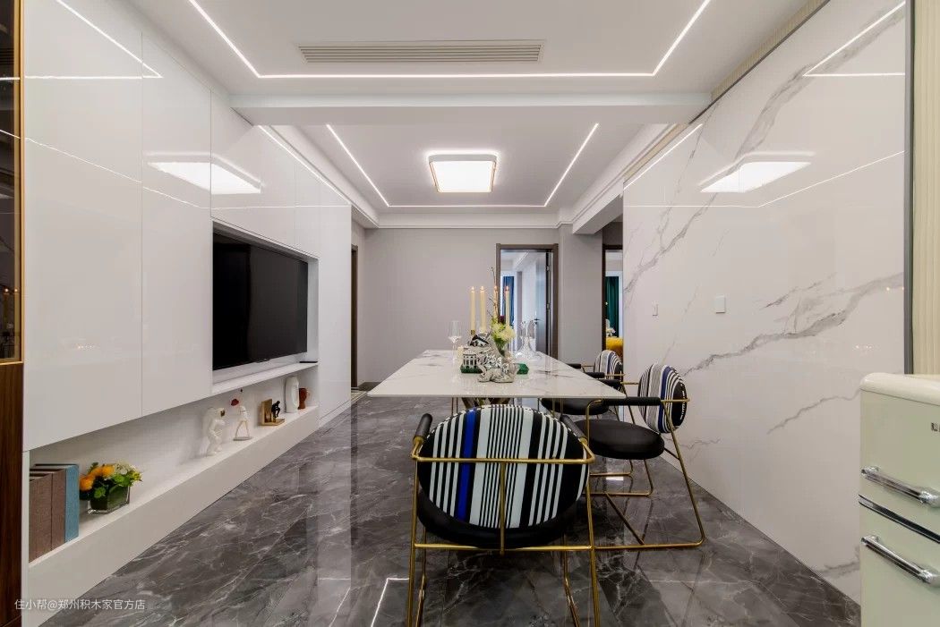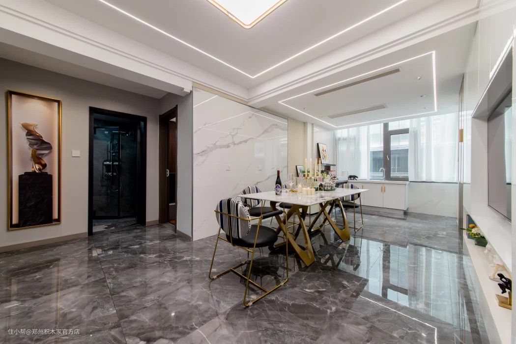 整个空间以简约、大气的色调为主,搭配了高级灰色地砖、岩板餐桌以及环形吊顶的设计,使得整个客厅呈现出一种低调奢华的感觉。这种轻奢风装修风格不仅体现了主人对品质的追求,还展现了一种简约、高雅的生活态度。