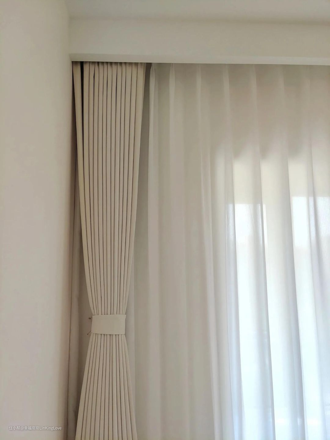 ②布帘加纱帘的情况下(双轨)20-25公分转角窗如果要做双层,并且想轨道不分段的情况,务必就到25公分以上。