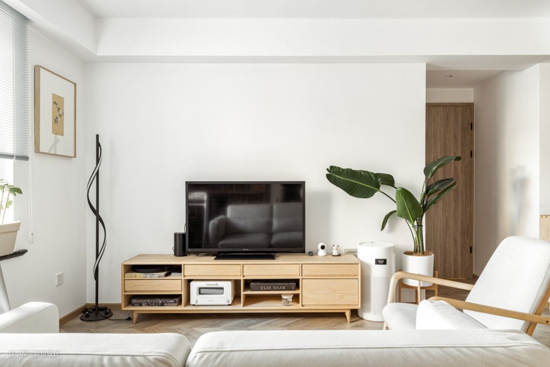 电视墙不做过多的处理,一组原木电视柜,一台小尺寸的电视机,既让空间的功能性得到了完善,又有了一个较为合适的视距。而少量的绿植增加,也让家居氛围充满了生机与活力。