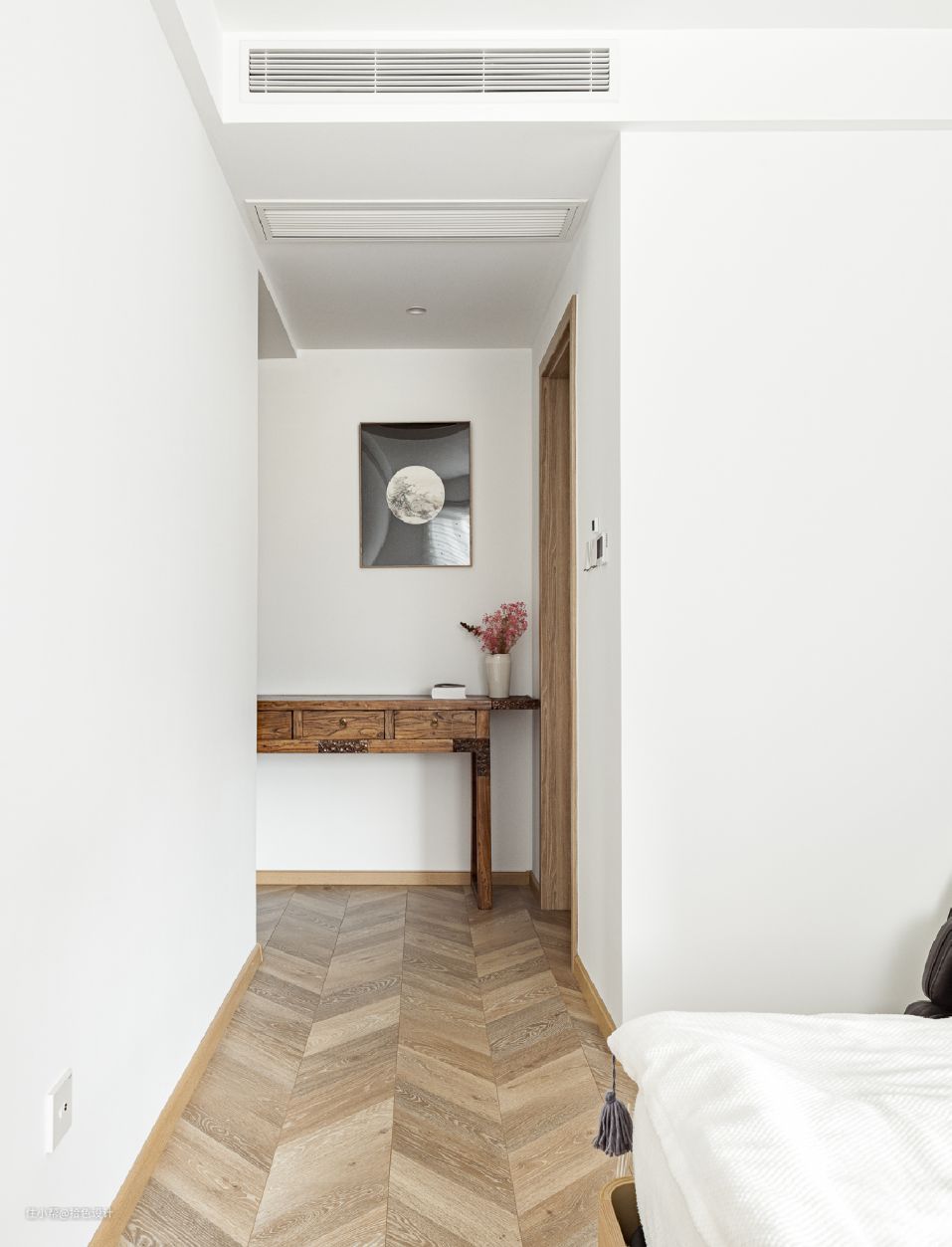 除此之外,木地板采用鱼骨拼花造型铺设,不仅赋予了视觉无限的延伸性,又增强了空间的律动与活力。当然,这种留白式的处理,也为空间保留下了更多的想象。