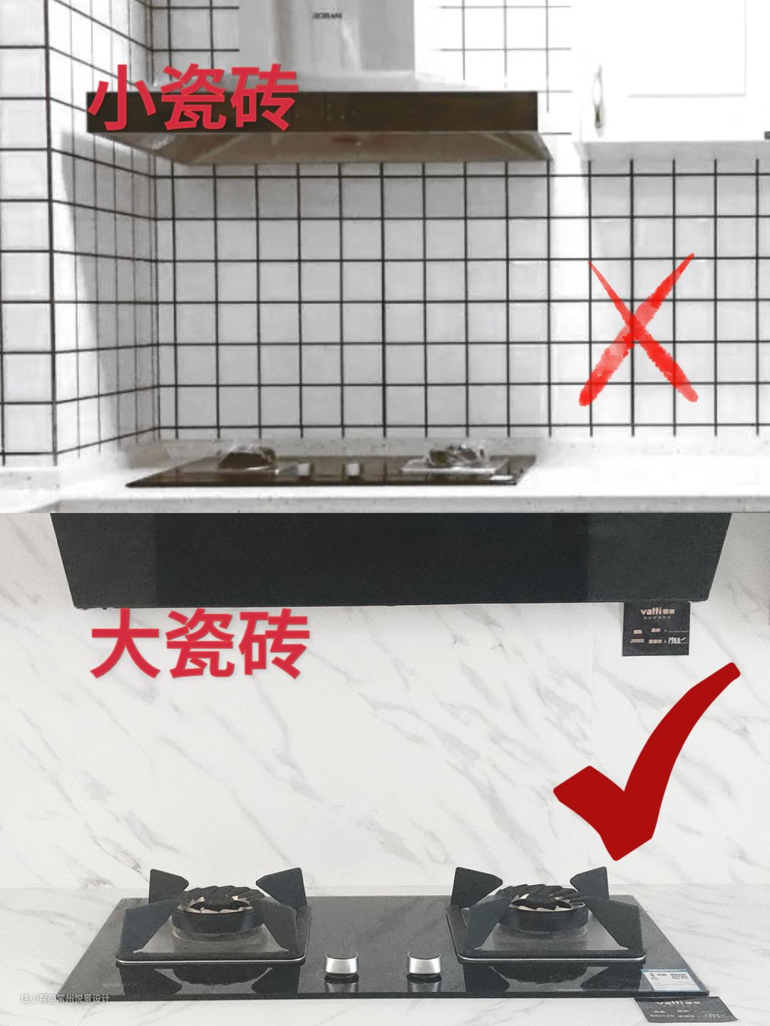 7️⃣瓷砖不建议选择小砖❌,不是很美观看起来比较小气,即使使用了美缝,缝里也非常容易积油,就容易发黄比较难清理🆘。这几年非常火的珐琅板,价格比较贵但是比较美观,而且方便清洗。不好的就是容易脱落,本质上就是搪瓷铁皮,好的地方是美观且能磁吸把厨具挂墙上。建议选择大瓷砖,美观,比小瓷砖好打理,价格也比珐琅板便宜,性价比之选💯。大瓷砖尺寸规格建议选择400*800的,地柜和吊柜之间高度一般都是80公分左右,正好做两块,中间就只有一条缝。或者选用800*800,正好一块,其他看不见的地方可以使用边角料或者杂砖。