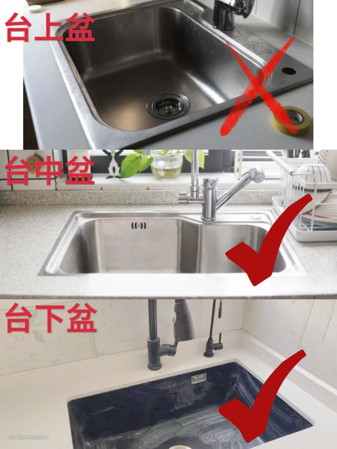 5️⃣台上盆台下盆台中盆怎么选❓台上盆稳定,但是他的安装方式及其的不美观,而且后期也比较难清理❌。现在大多数人都已经不做台上盆了。台下盆比较美观,台面上的污渍和垃圾也比较好清理,❎缺点就是安装方式有掉落的风险,后期维护也不是很方便,⚠️最大的缺点就是有卫生死角,因为他的玻璃胶是打在台盆里面边缘处的,所以这个缝隙或多或少的会进点水,就会导致发霉,也有可能会往橱柜漏水,到时候清理就十分的麻烦了。选择单双槽的时候建议大家选择大单槽,不要选择有隔板的。台中盆安装比较方便✅,虽然比起台下盆没有这么美观,但是比较稳定💗,几乎没有卫生死角,就算是出现了问题也比较的好处理。⚠️但是台中盆的安装的要求是非常的高的,需要一定的技术,所以不推荐大家现场做,最好是拿到台面工厂去集成。