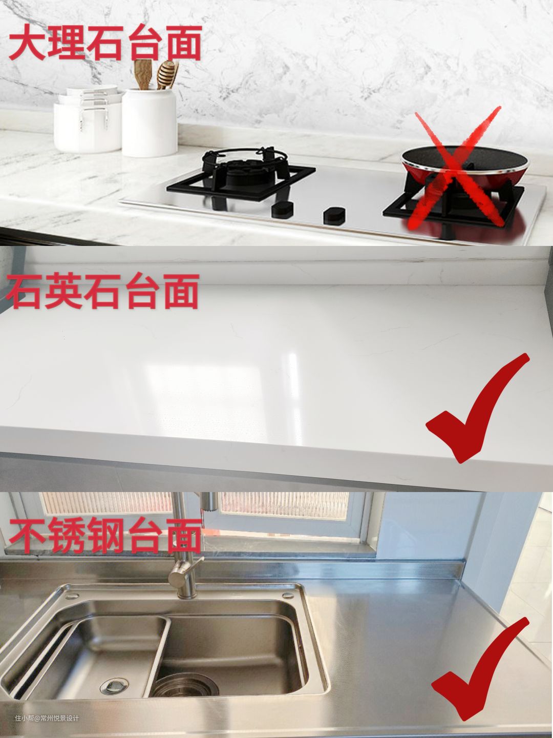 1️⃣厨房台面怎么选择❓台面不建议选择大理石台面❌,大理石台面价格贵还容易断裂。➡️预算不是很充足的话,建议使用石英石台面,便宜耐用又耐看。⚠️不过要注意的是,石英石要挑选含量高一点的,不然酱油老抽辣椒油滴到台面上,稍微长一点点时间不清理的话容易渗色😫,以及容易生锈的东西要是长时间放在上面也容易渗透进去。➡️预算足够的话,可以考虑岩板材料,好看耐磨耐刮耐高温,也不存在渗色这一点,但岩板和瓷砖一样的,边缘比较脆弱容易崩边,⚠️要注意不要碰撞。➡️还可以选择不锈钢台面,不过要选择304食品级不锈钢材质的,耐用,不怕磕碰,就算用刀刮也基本不留痕迹,还可以直接把盆焊在台面上,解决了很多的问题。还可以不用砧板,直接在上面切菜。缺点就是便宜的不美观,美观的价格比较贵,一体式的不锈钢台面更贵。