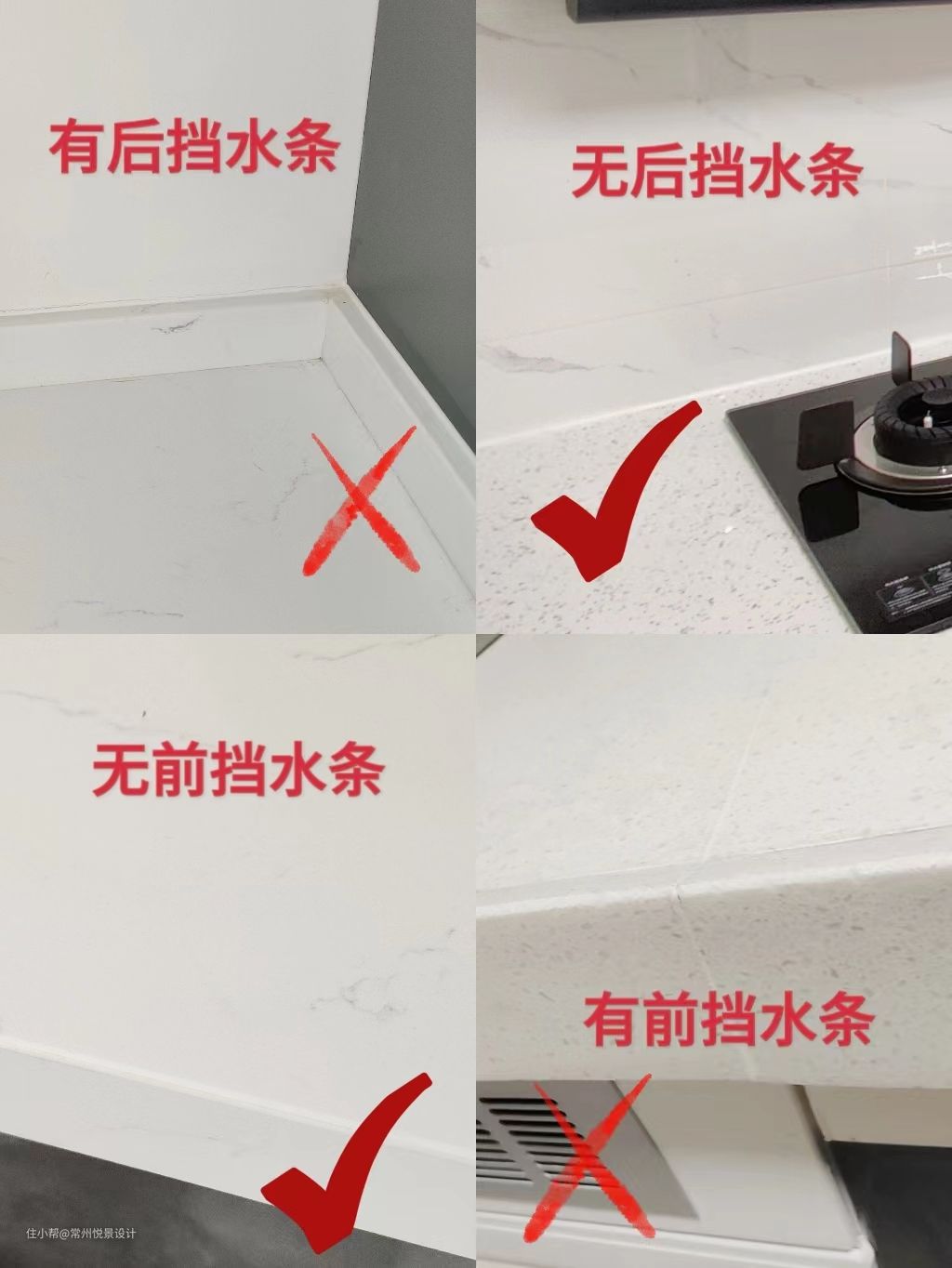 6️⃣到底做不做防水条?能不能不做挡水条首先取决于你的瓦工师傅墙砖砌的平不平整,不然的话,台面和墙面之间会有缝隙,打胶也会打不匀。不做挡水条会非常的不美观且会容易漏水导致橱柜发霉。但是挡水条有卫生死角,🙋♀️不爱勤劳清理的一定找好点的瓦工师傅做,这样就可以不做挡水条。做后挡水条,没必要做一体式的,分体的就足够了。前挡水条做不做看你使用厨房的习惯,平时做饭老是渗水到地面的话还是建议做前防水条。要是觉得砧板不好放的可以舍弃前防水条。❗️值得注意的是,不管做不做防水条,打胶一定要使用防霉的玻璃胶,千万不可以用美缝哦‼️