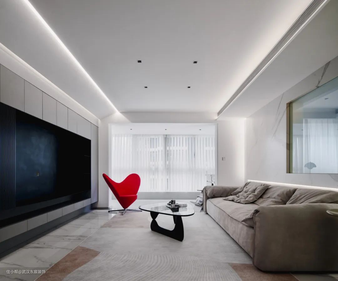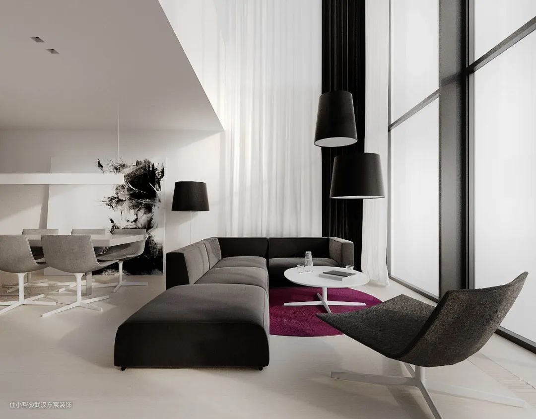 如果怕整体太单调,可以在休闲椅、茶几上想办法,可以用曲线、弧形这些造型别致的款式,或者干脆用黑色的茶几,彩色的休闲椅甚至是深色的地毯来协调,去平衡空间的色块。