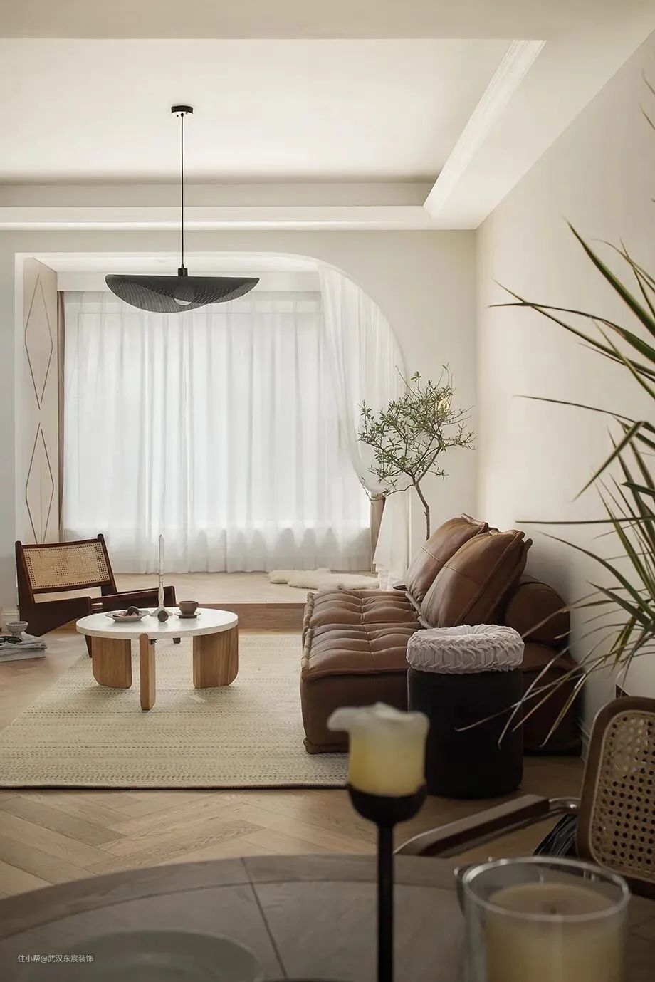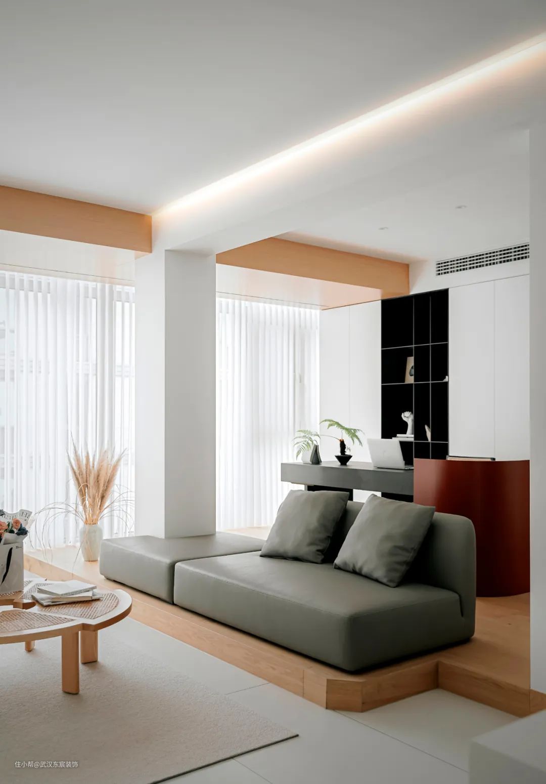 窗帘被作为空间的第四面墙,沙发跟着窗帘走也能起到呼应的效果。