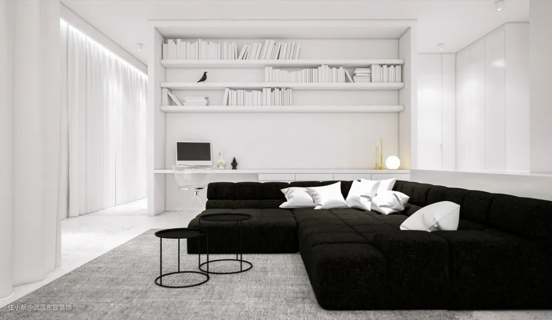 如果喜欢活泼一点,有反差效果的,可以运用第二点技巧,“跳色法”,比如浅色的空间直接搭配一个黑色的沙发来一个大反差,增加整体的质感。