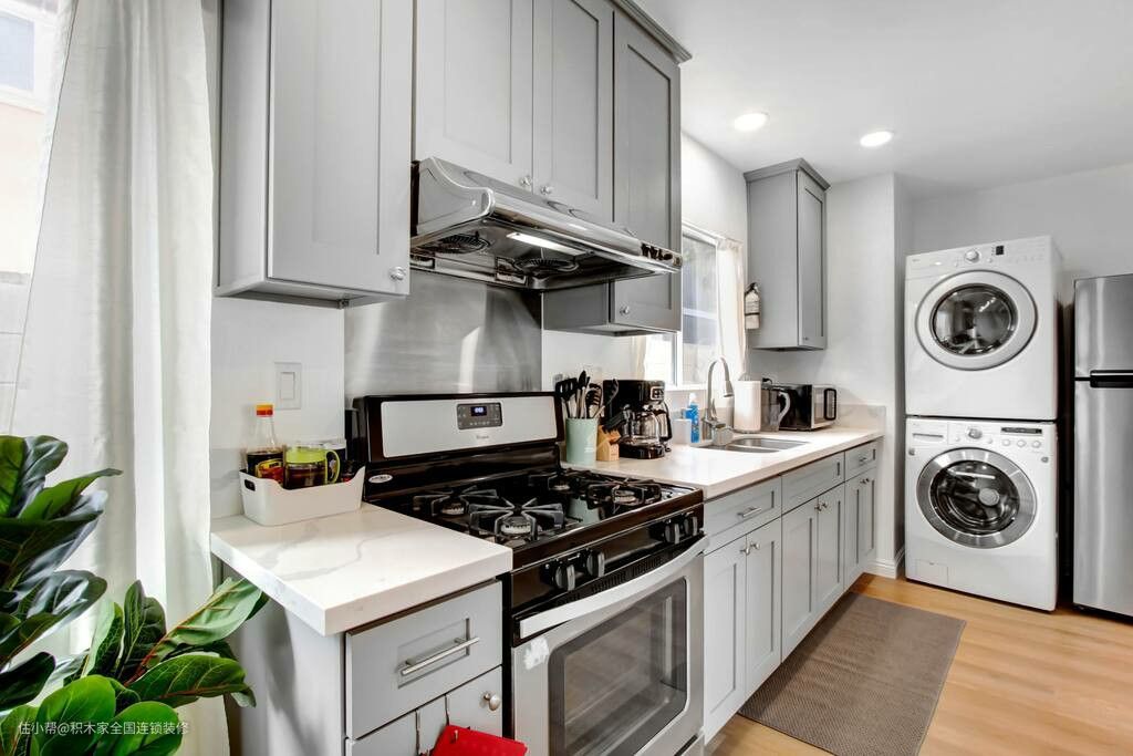 厨房采用开放式设计,L形结构使得操作空间更加方便。一旁设有餐桌,既满足了用餐需求,又增加了家庭成员之间的交流与互动。厨房选用简约的橱柜和台面,让整个厨房看起来整洁有序。灰色和棕木色的搭配,使得整个厨房空间更加和谐统一。