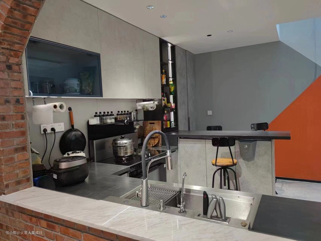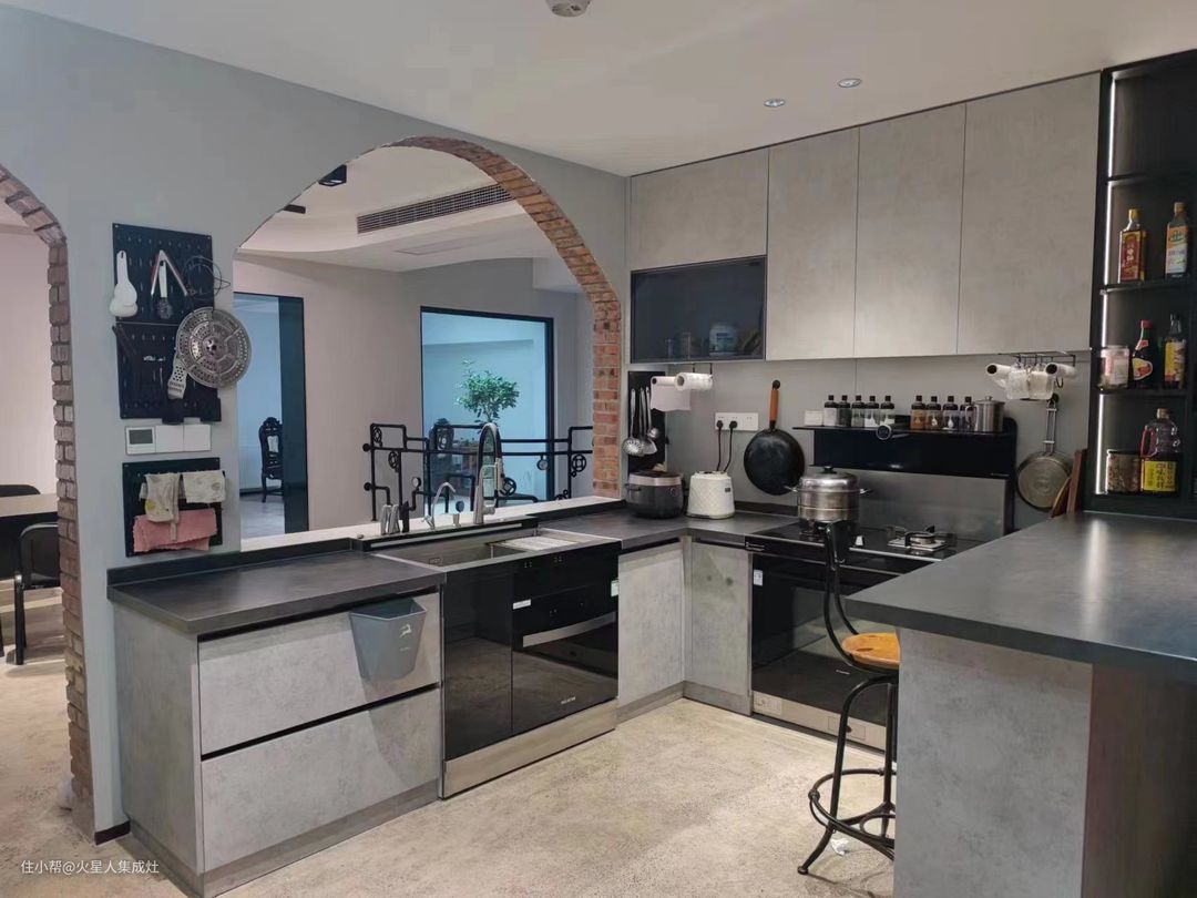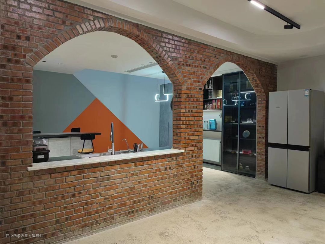 拾级而上,来到二楼厨房,一番截然不同的现代风面貌让人眼前一亮。墙体裸露,展现出满墙的复古红砖,拱门窗口更添了一丝工业感,让人联想到面包房的烤炉,粗犷却温暖。