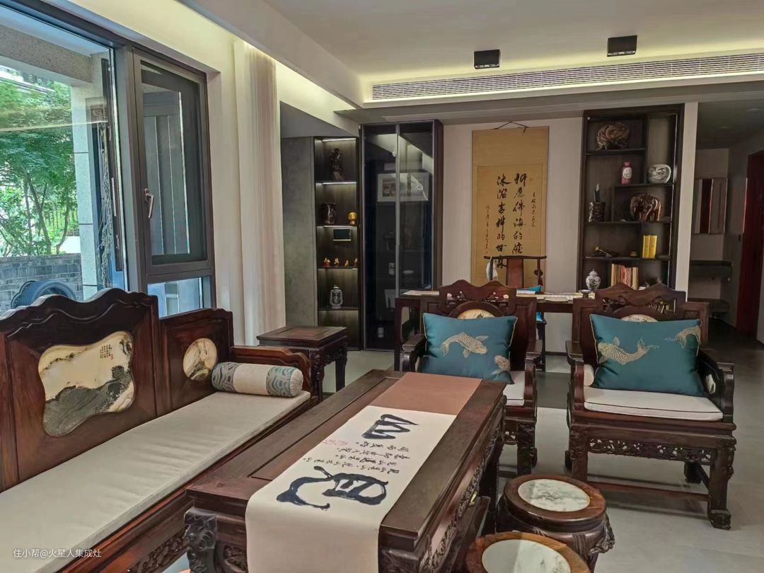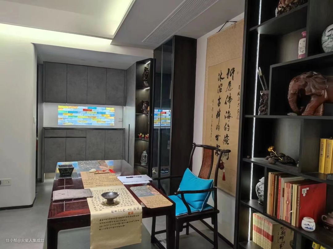 往后看去,是主人的书桌,桌上展着新写的字帖,用白云镇纸压着,墨迹还未干,似乎还散发着淡淡的墨香。桌边是一把红木太师椅,配上靛蓝锦缎坐垫,韵味十足。墙上挂着书法挂轴,字体遒劲有力,又圆润浑厚,禅意满满。左右打了两列黑胡桃木展示柜,摆着木雕瓷器和史书史册,释放出满柜书香。