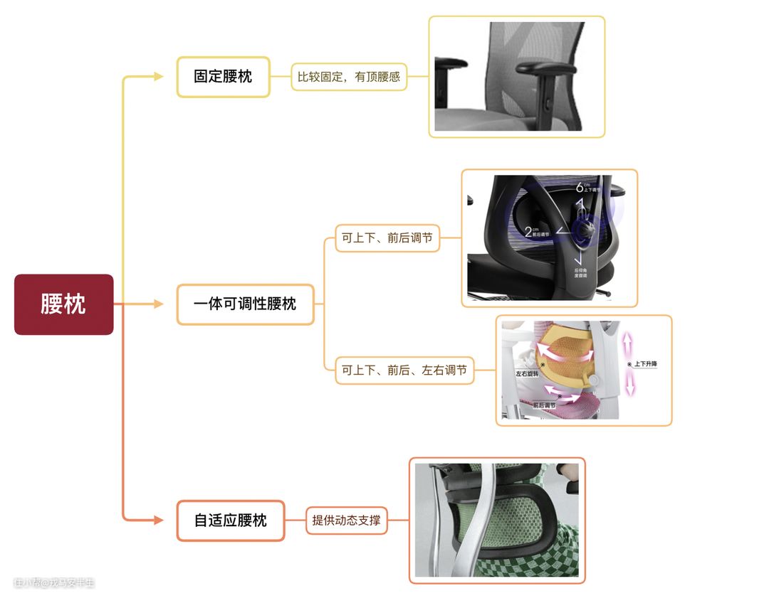 - 固定腰枕就是前面说到的和椅背是一体的,角度是固定的,无法调节。
