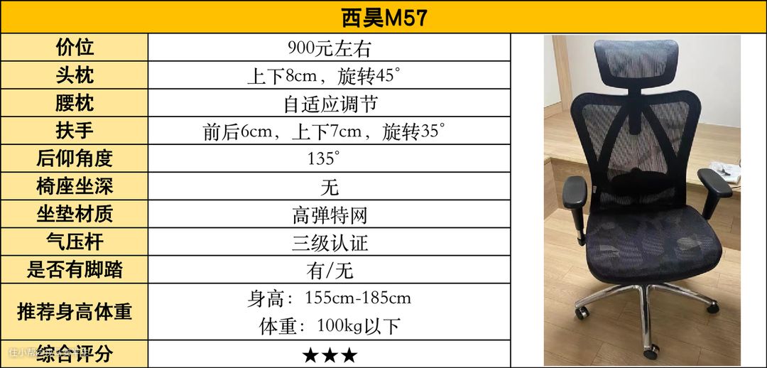 西昊M57的腰靠是双向可调节,底盘的是加厚钢制设计,一体式椅背,腰部的支撑性比较强。头枕有8cm的升降调节,适合不同身高人群。整体的承重力更好,体重偏大的朋友可以考虑。