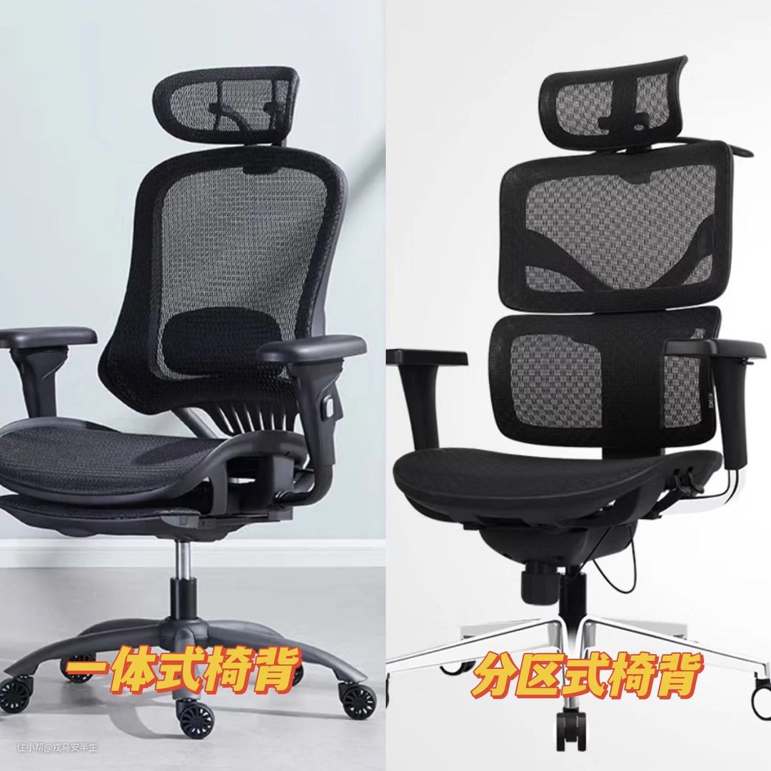 - 分区式椅背:整体支撑力会更加舒适,柔软,对脊椎的贴合度更好。不过有很多大体重朋友反应分区式椅背支撑力不够,过于柔软。