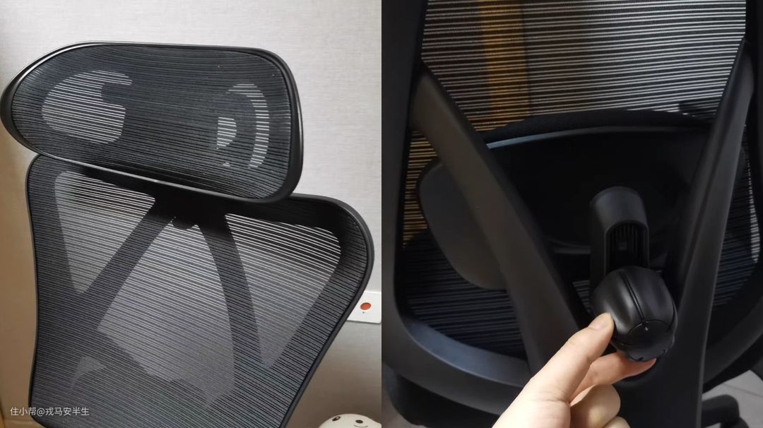 它的头枕比较高,适合165cm以上的朋友,这款没有座深调节的功能,其他调节性都差不多,但是这款的网布比它稍微偏硬一点点,网孔更大,摸上去有一些粗糙。