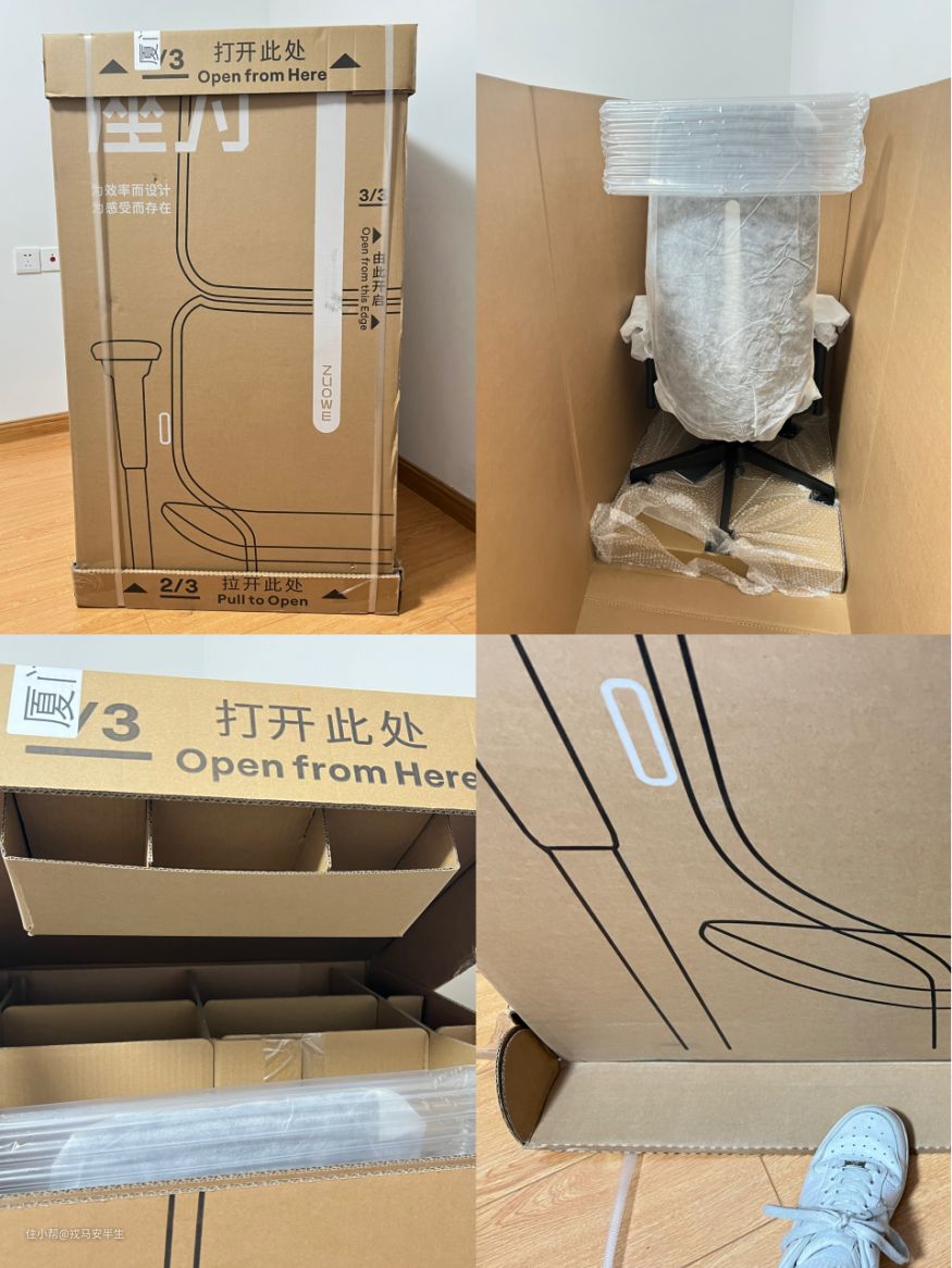 刚收到这款椅子的时候,被这包装给吸引了,因为它是整椅发货,外箱没有出现破损情况,直接脚踩箱低就能直接打开。