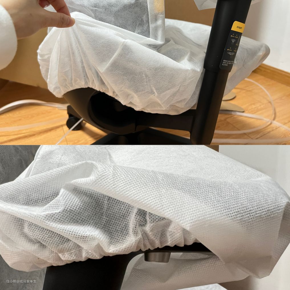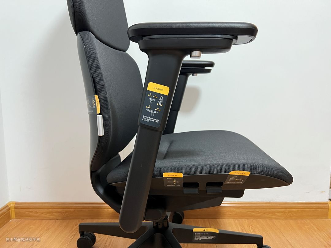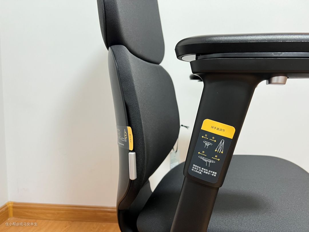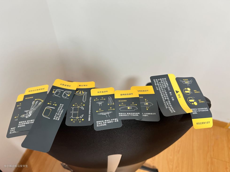 椅子在每个可以调节的地方,都贴了提示纸条,等于说把说明书直接摆在你面前,简单明了。