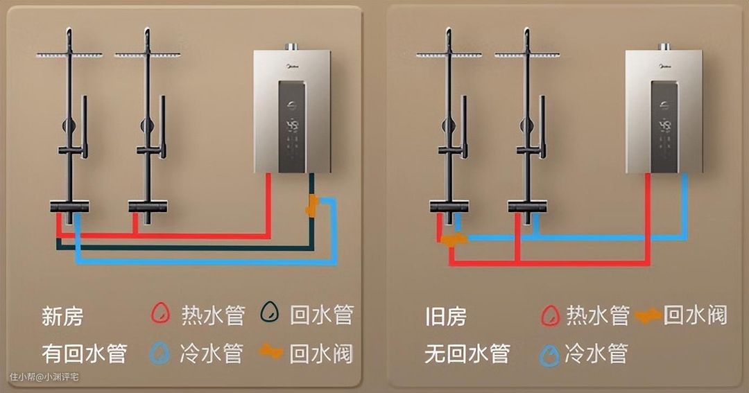 如上图,一种是利用单独的回水管进行回水(左);另一种是把冷水管当成回水管使用(右)。