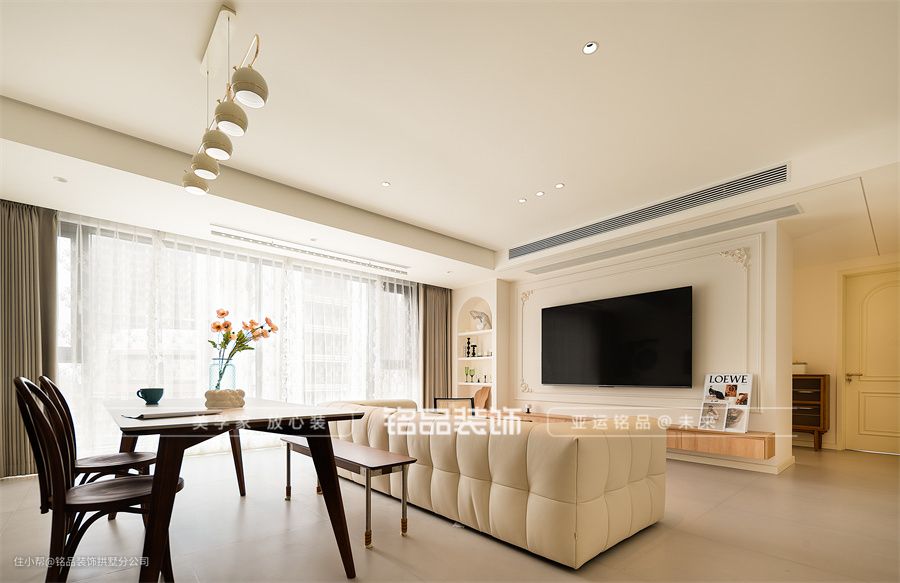 大家可能也发现了奶油风中的灯光方面有一个很大的特点——不用主灯,因为奶油主打的就是氛围感,无主灯能更好的突出周围的氛围感。可以用灯带、洗墙灯或轨道灯等,打造不同的光影层次感。