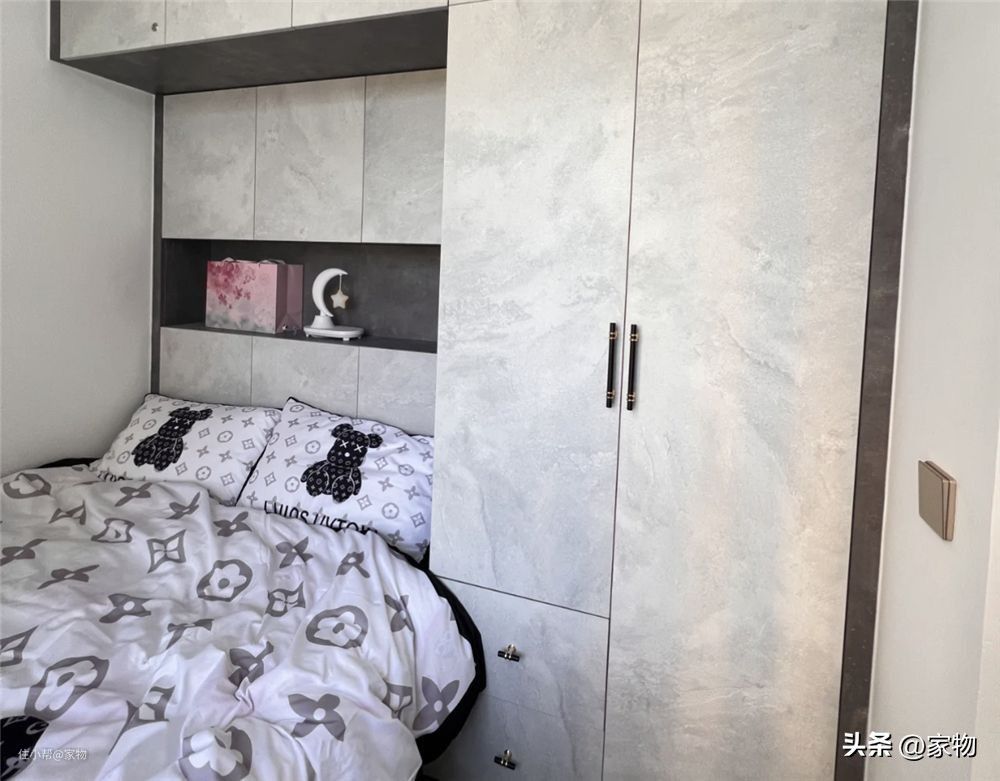 次卧室主要是留给两个孩子和老人的,一组上下铺,和柜子上面的格栅上铺床,让这间狭长的小卧室可以睡下三口人,底部的柜子内也可以收纳较多的衣物和杂物,这空间利用我也是服了。