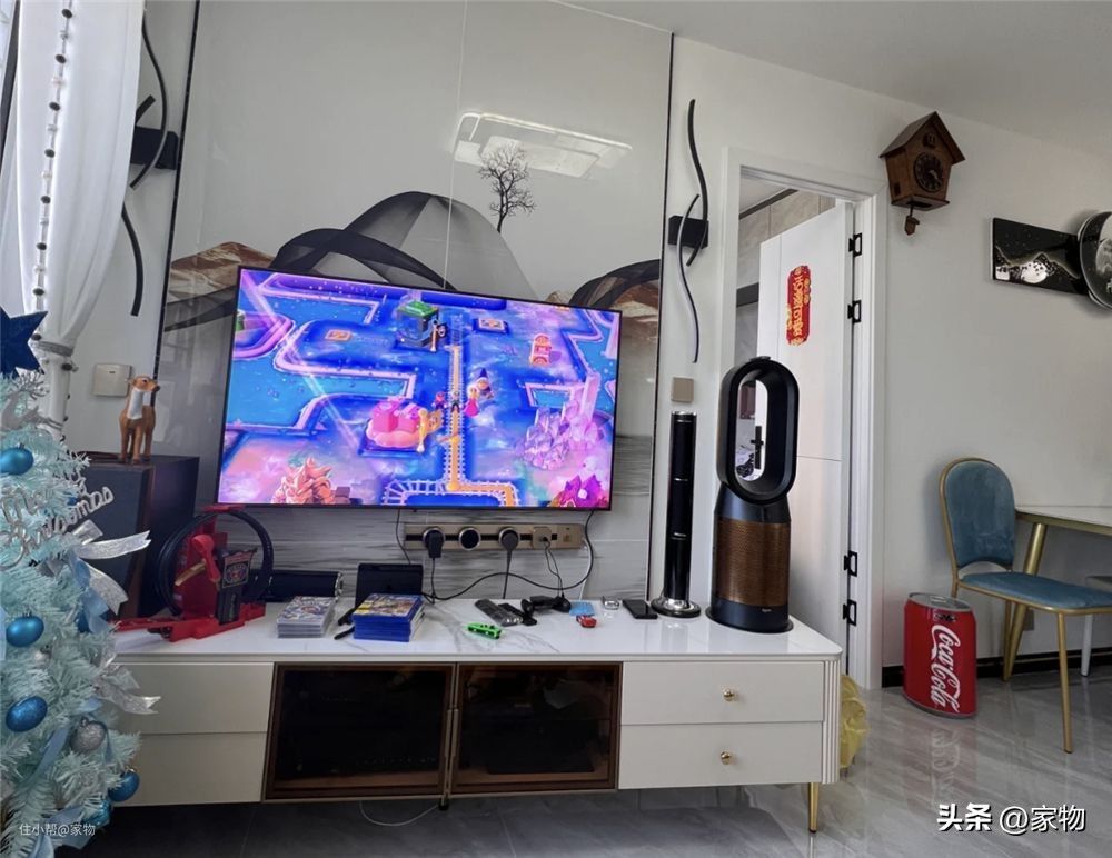 从主卧门到窗户的位置,不到一米多的长度做成电视墙刚好合适,但因为电视墙对面没有地方放沙发,一家人看电视也只好把餐桌处的餐椅搬过来,一定程度上也算节省了室内为数不多的空间。