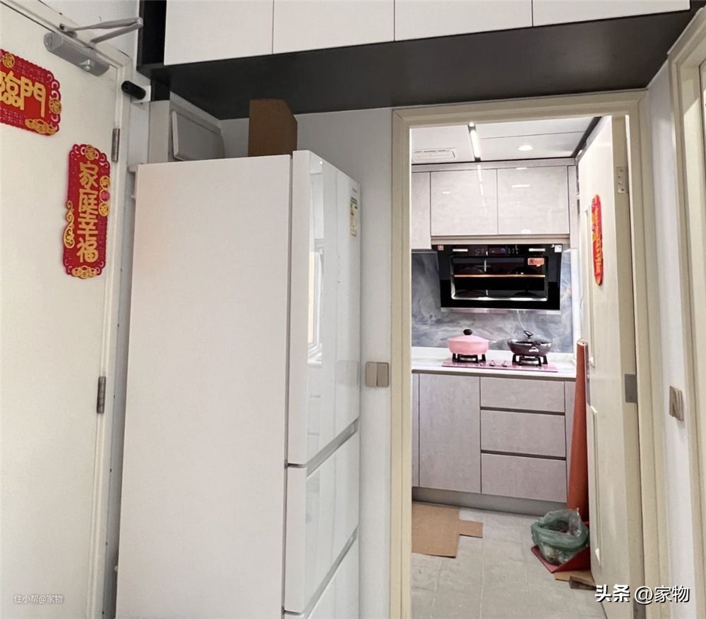 一进门的左手边,冰箱放在厨房外面,冰箱的上面也做了吊柜用来收纳家居杂物,对于这样的狭小空间来说,既然横向空间不足,那么纵向空间半平米也不能浪费。