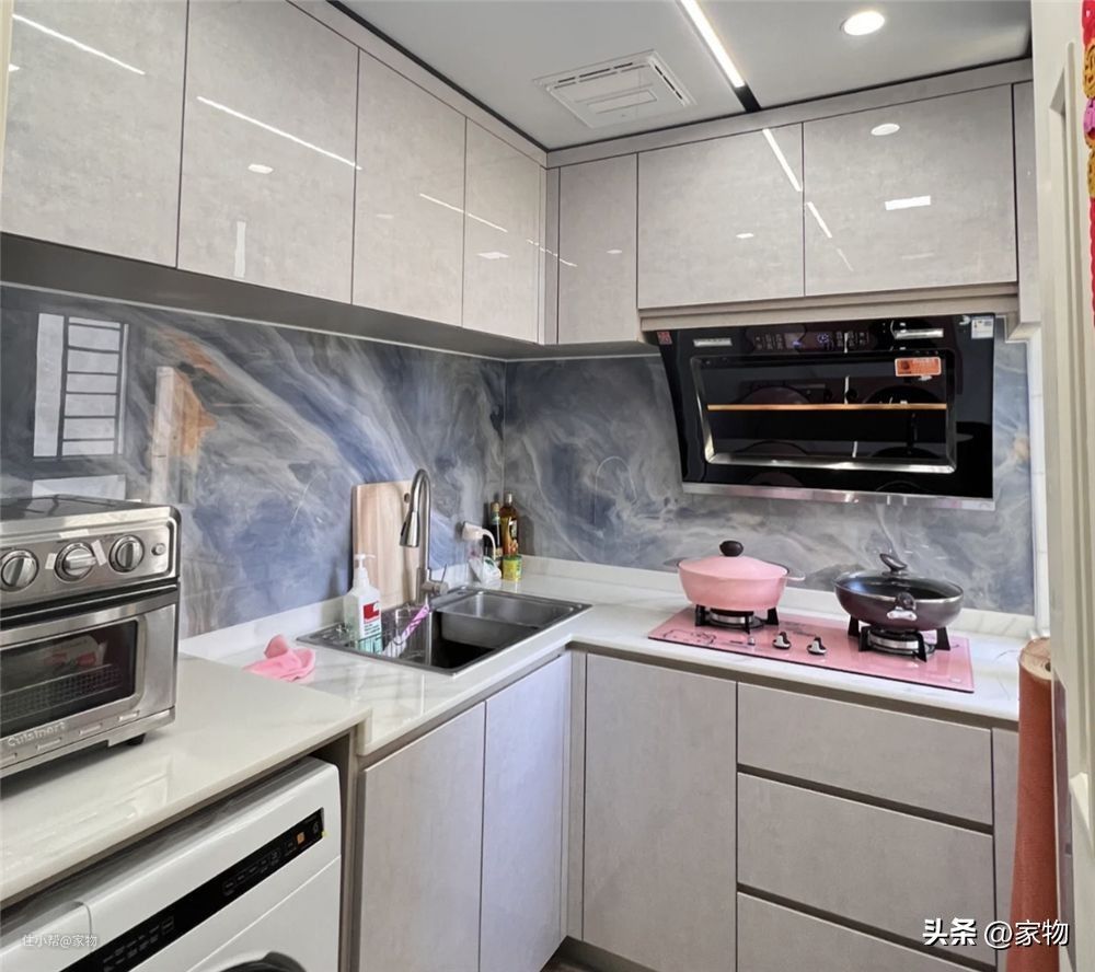 厨房内也同样如此,不仅做了L形的吊柜+底柜来收纳各种碗碟餐具,还将洗衣机嵌入了橱柜中,做成高低台,上面也可以放一些小厨电,刚好合适。
