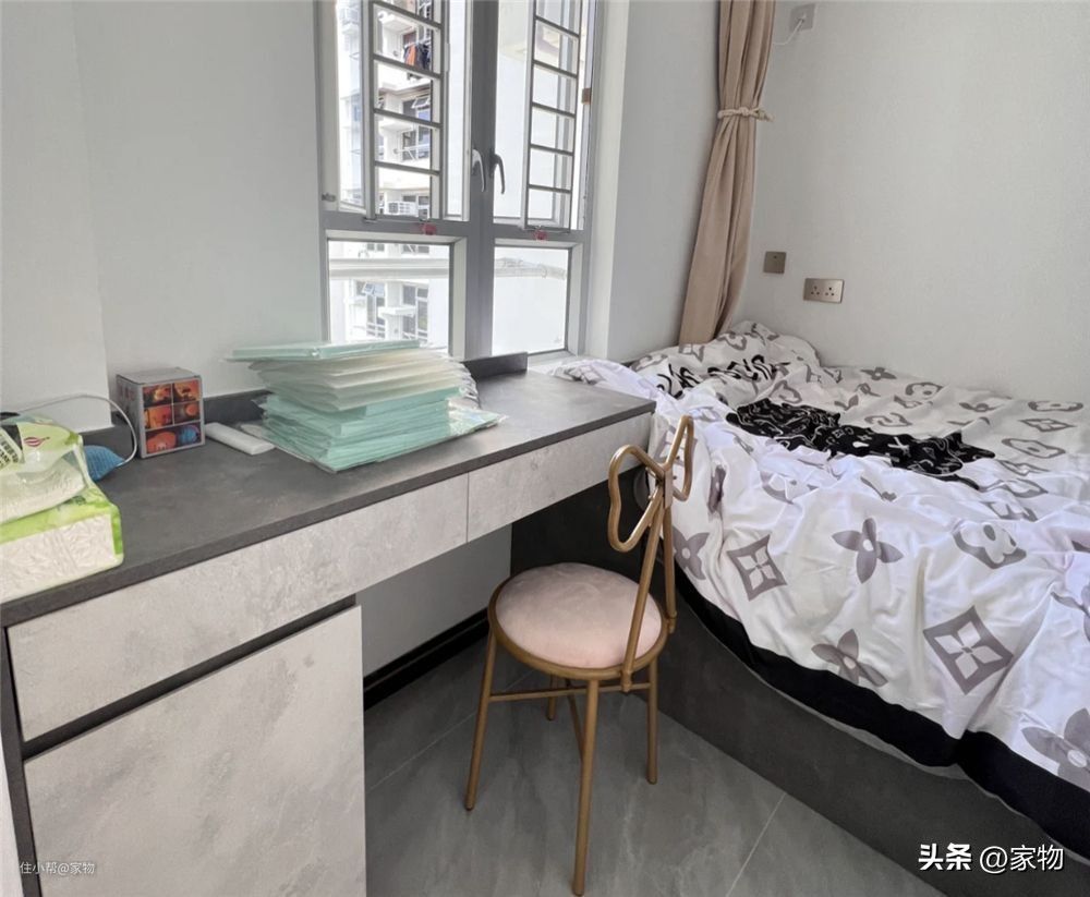 从电视墙进入旁边的主卧室,发现它比想象中要宽敞不少,进门左手边做书桌,靠窗位置刚好够这对夫妻化妆、工作;而床铺做成地台床,不仅睡眠空间更宽敞,同时底部也可以收纳各种物品。