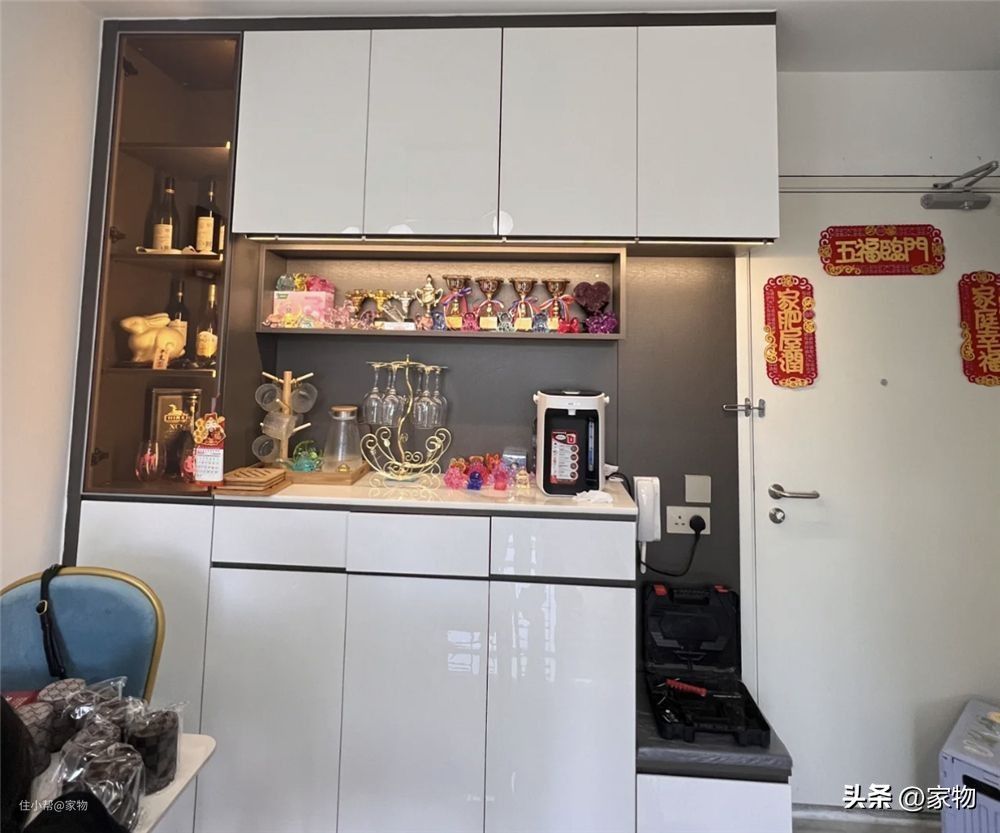 推门既然怒家中,玄关柜其实是和餐边柜相融的,柜子留出了换鞋区,旁边的吊柜和底柜也可以收纳各种家居杂物。