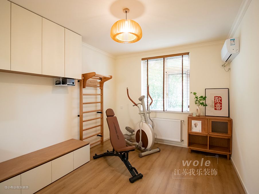 将次卧设计成多功能厅,把健身房搬回家。平时一家人可以在这里健身运动、休闲读书。一侧还做了吊柜和地柜,增加储物空间。