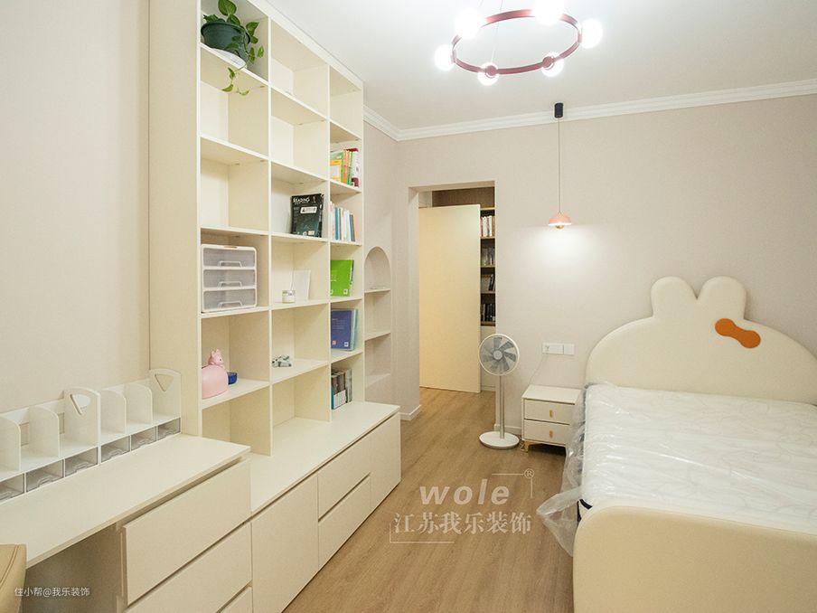 儿童房以白色为主色调,定制的纯白书桌和书柜的设计,为孩子提供了一个舒适轻松的学习与阅读空间。通顶式衣柜,节省空间又极大的增加了衣物的收纳。