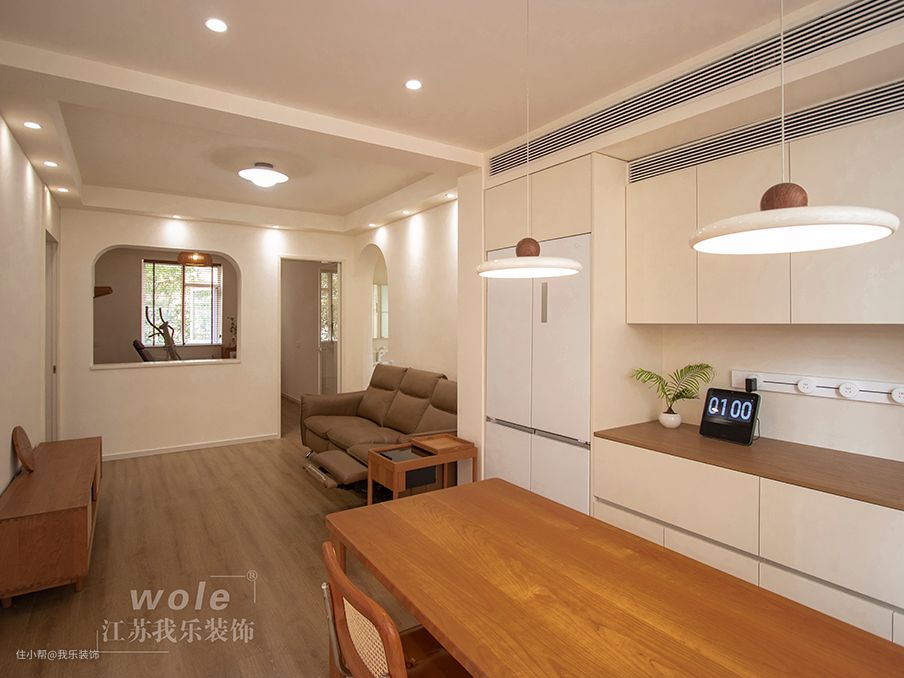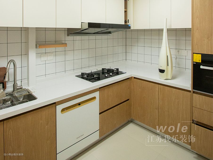厨房与客餐厅的风格保持一直,白色的吊柜配暖黄色原木地柜,也是非常经典的风格搭配,简约时尚带着复古。