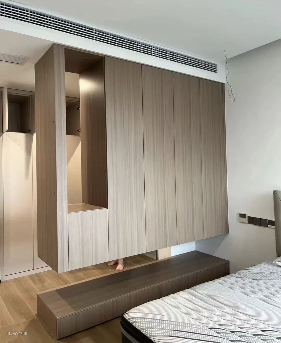 衣柜不做通顶,而是普通衣柜的高度,原本上方留的空隙,转变一下思路,变成留在下面,从而还能多出一圈抽屉收纳、床头柜,视觉层次感也更强。