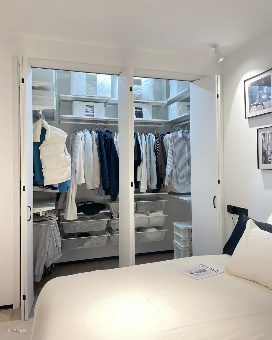 如果主卧算大却又不宽广,不能完全隔出来一个衣帽间,还想要一个衣帽间的家庭,用衣柜划分空间,又能保持通透这个效果绝对是非常感人的。