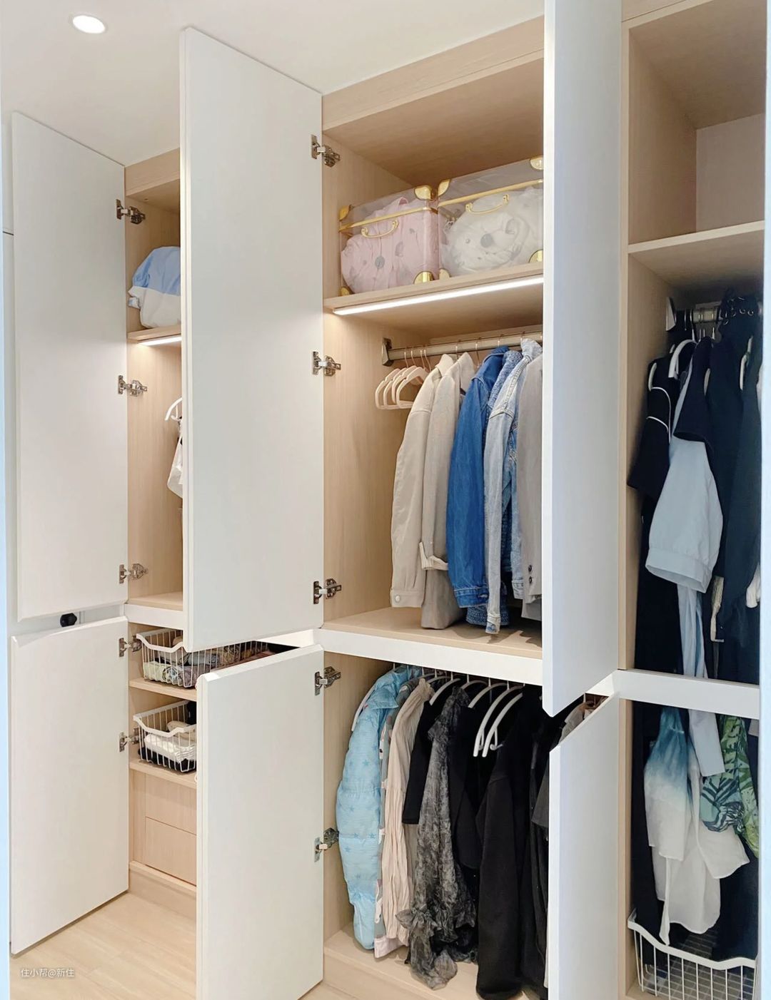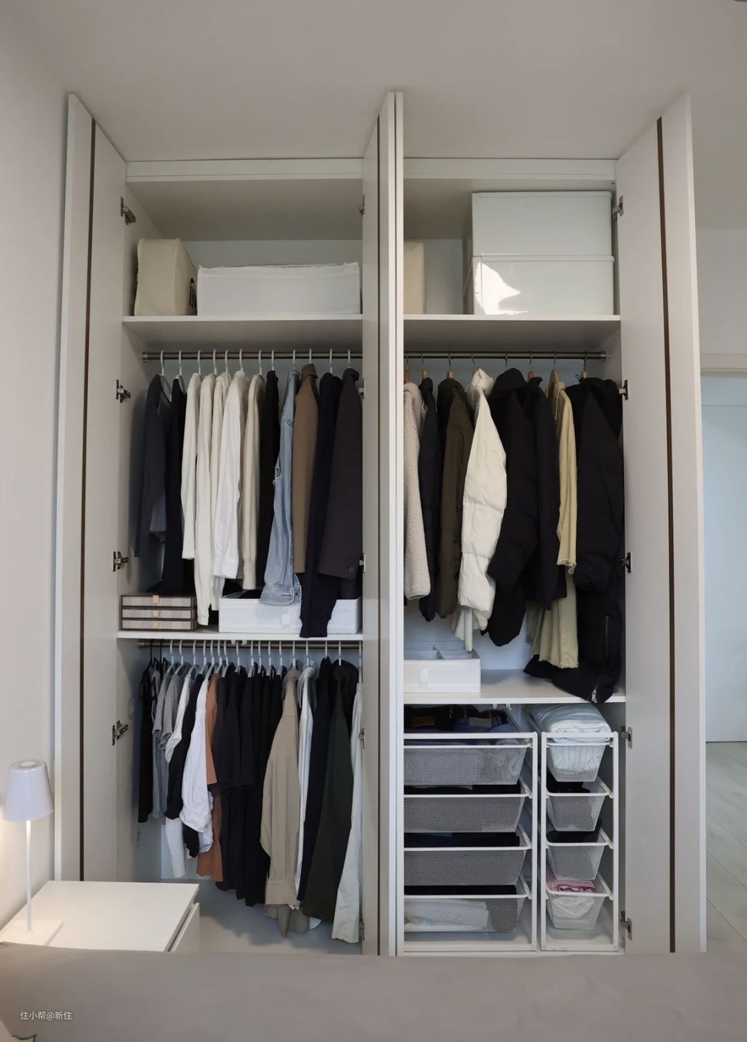 再看内部布局,上中下按照衣物高度与整理习惯布局,很容易打造出如衣帽间般简单整洁。