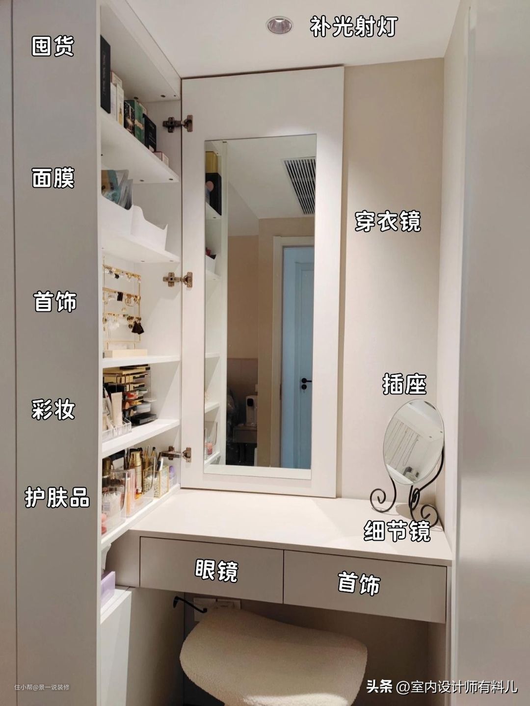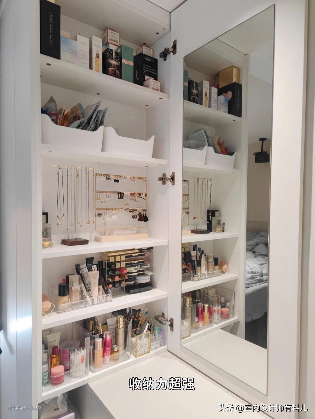 上柜自上而下用来囤货,面膜、彩妆、护肤品,柜门内嵌穿衣镜,顶部预留射灯补光,化妆时极其方便。