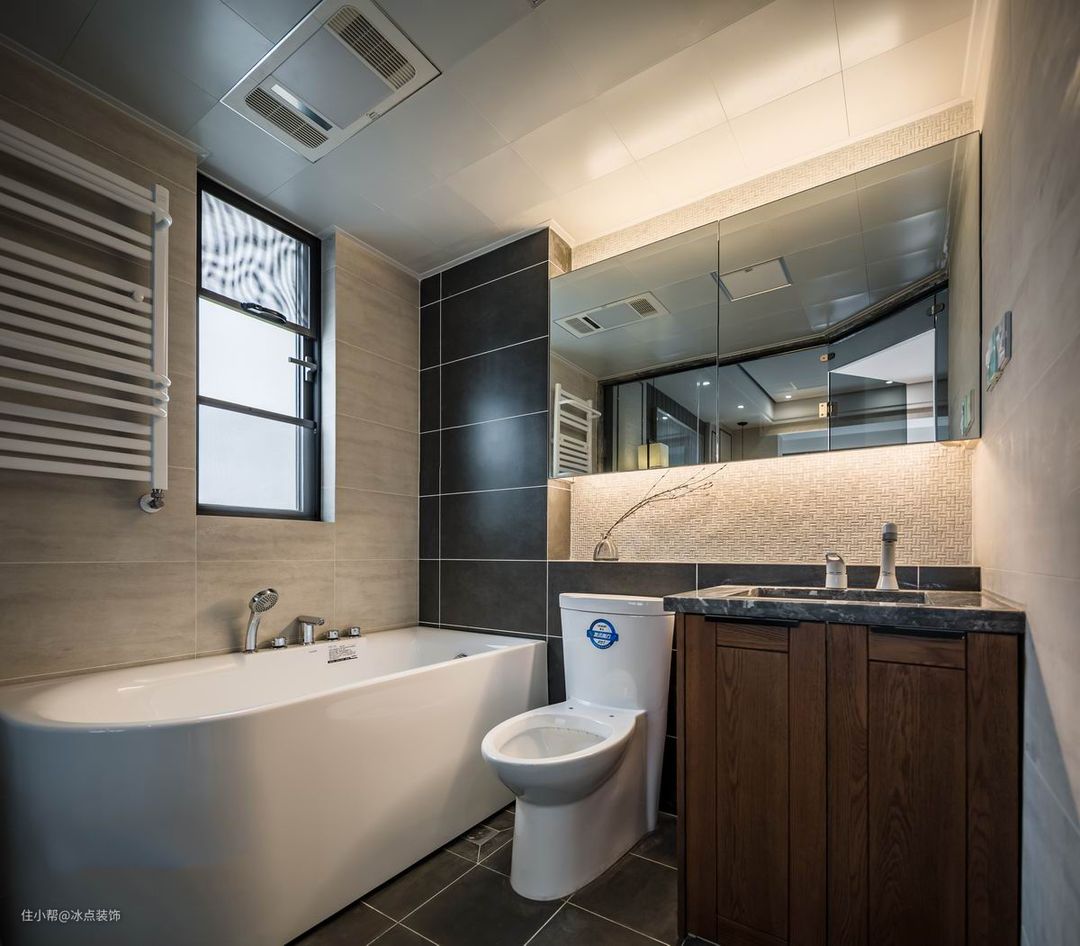 卫生间的话主打的就是一个实用,黑色瓷砖打底,不仅耐看,而且还方便清洁,马桶选择智能马桶,从此解放双手