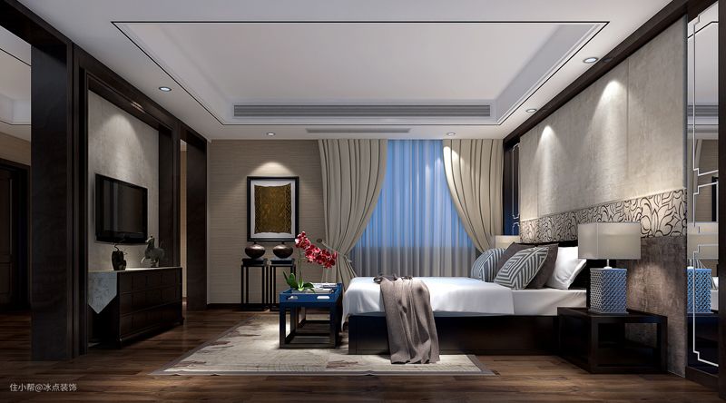 房间的话依然是新中式的主色调,并采用墙布的形式来进行装饰,并用墙画合和装饰品,来增加整个房间的韵味,简单而又不失大气