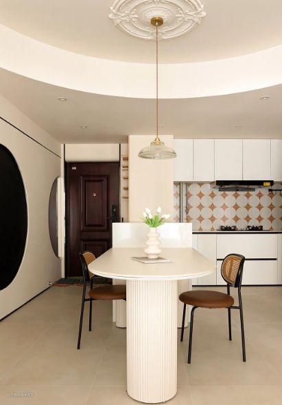 让我们通过一个具体的案例来进一步理解极简奶油风。这是一个位于国外的公寓,设计师巧妙地将极简主义与奶油风结合在一起,创造出一个充满温暖与舒适的生活空间。客厅中,白色的墙壁和地板与奶油色的沙发和地毯形成了完美的对比。厨房中,木质的吧台椅和棉麻布的餐巾增添了乡村的温馨感。卧室里,米色的床单和窗帘与白色的墙壁相得益彰,营造出一种简洁而舒适的氛围。