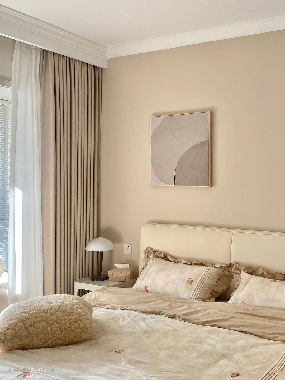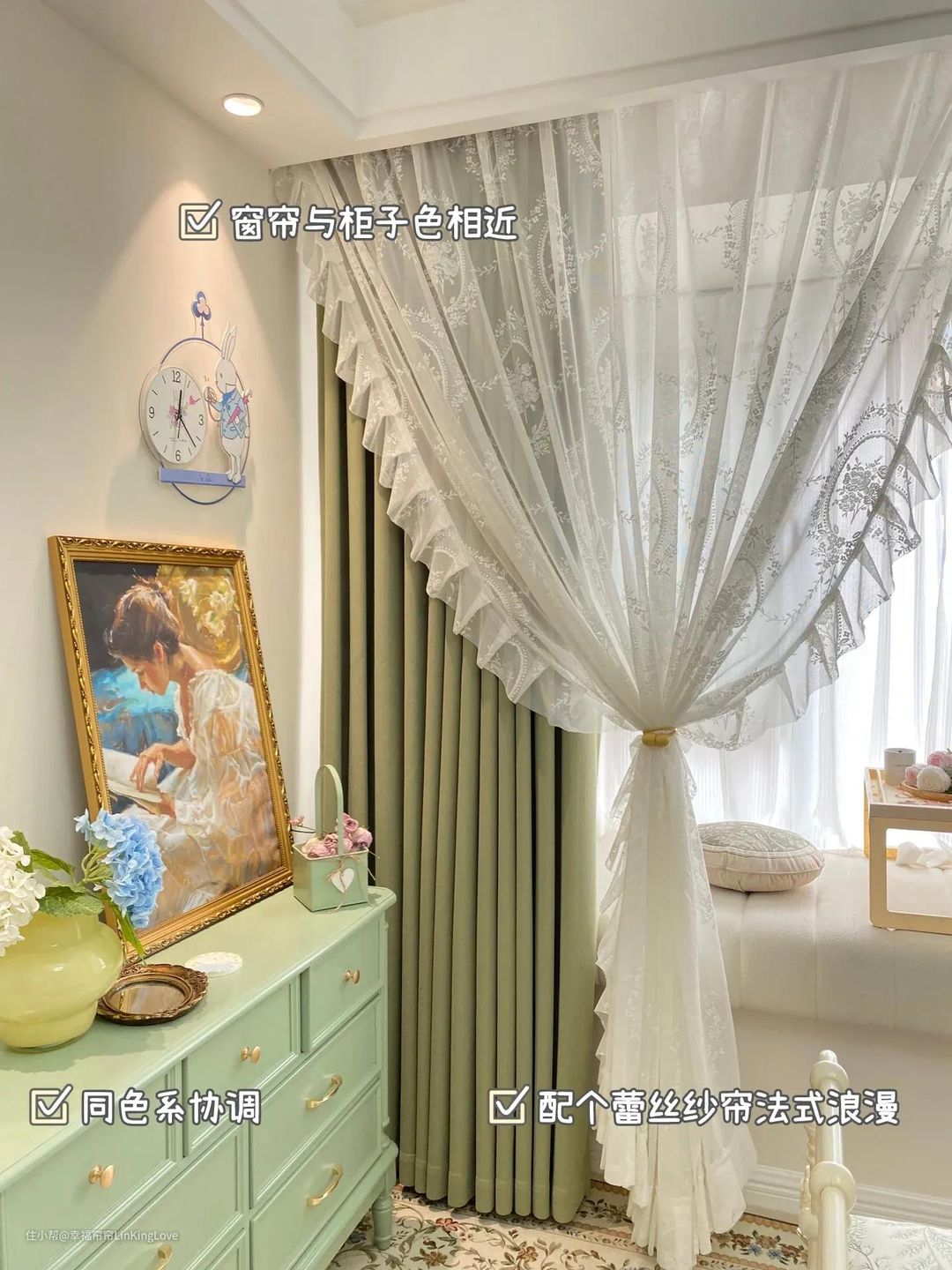 ⑥窗帘与周边小物件点缀色呼应:比如床头柜、梳妆台、茶几等,小范围相近色也比较自然高级