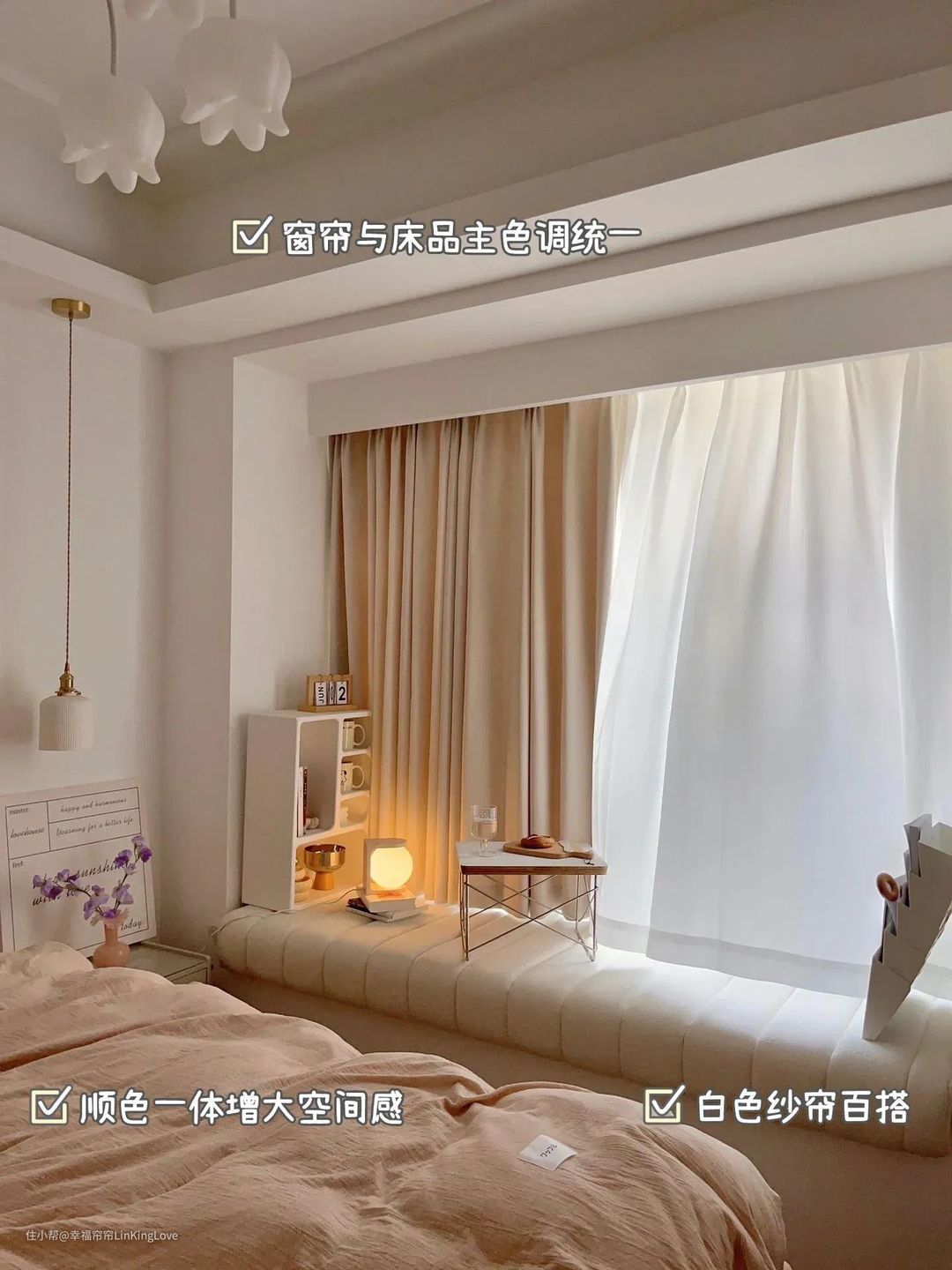 ④窗帘比墙布浅一个色调:墙深帘浅,用白色家具中间调和一下