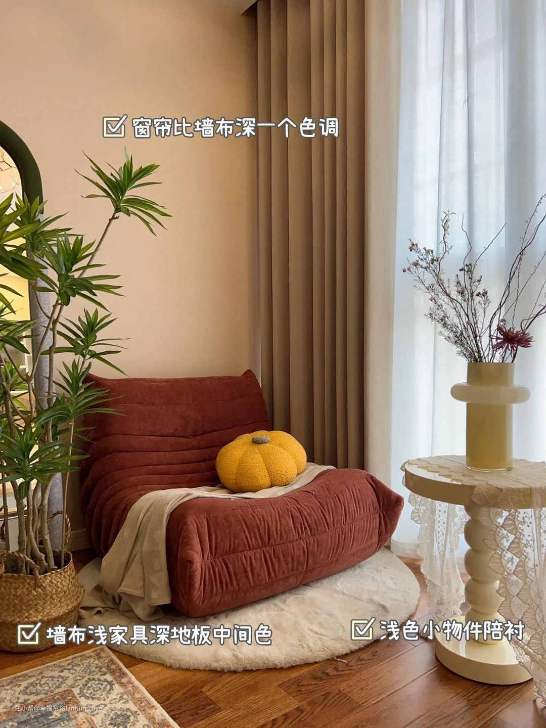 ③窗帘与墙布色统一:从上到下都选相近色系,地板选其他基础色自然过渡