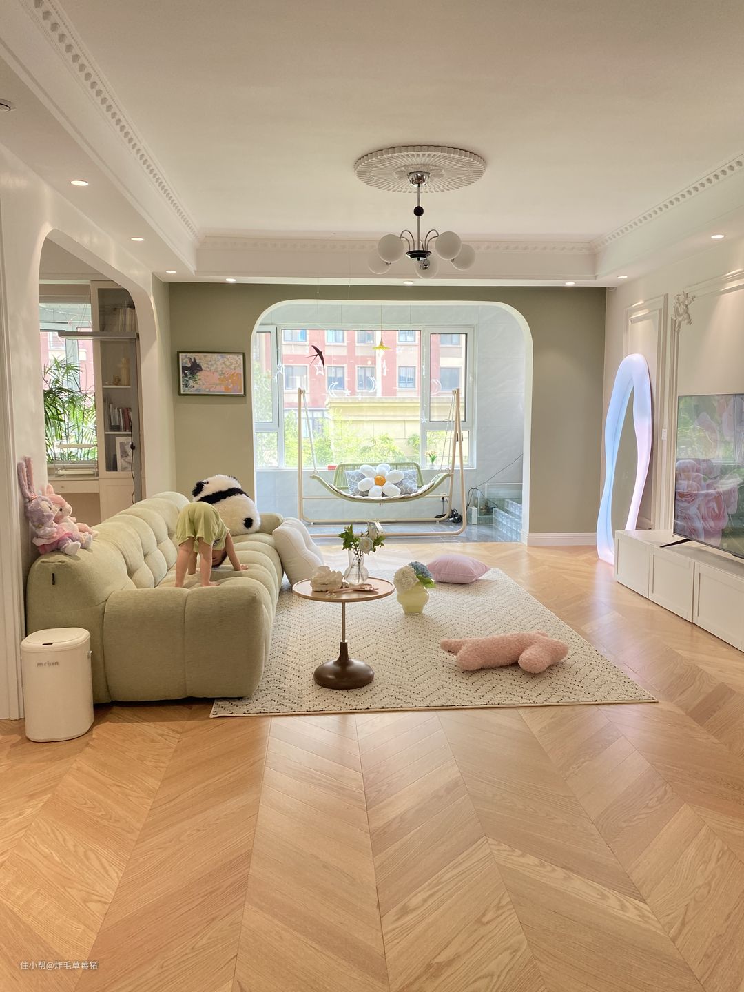 ▫️墙面是石膏线搭配的乳胶漆,大面积是珍珠白,复古绿作为跳色,很吸睛