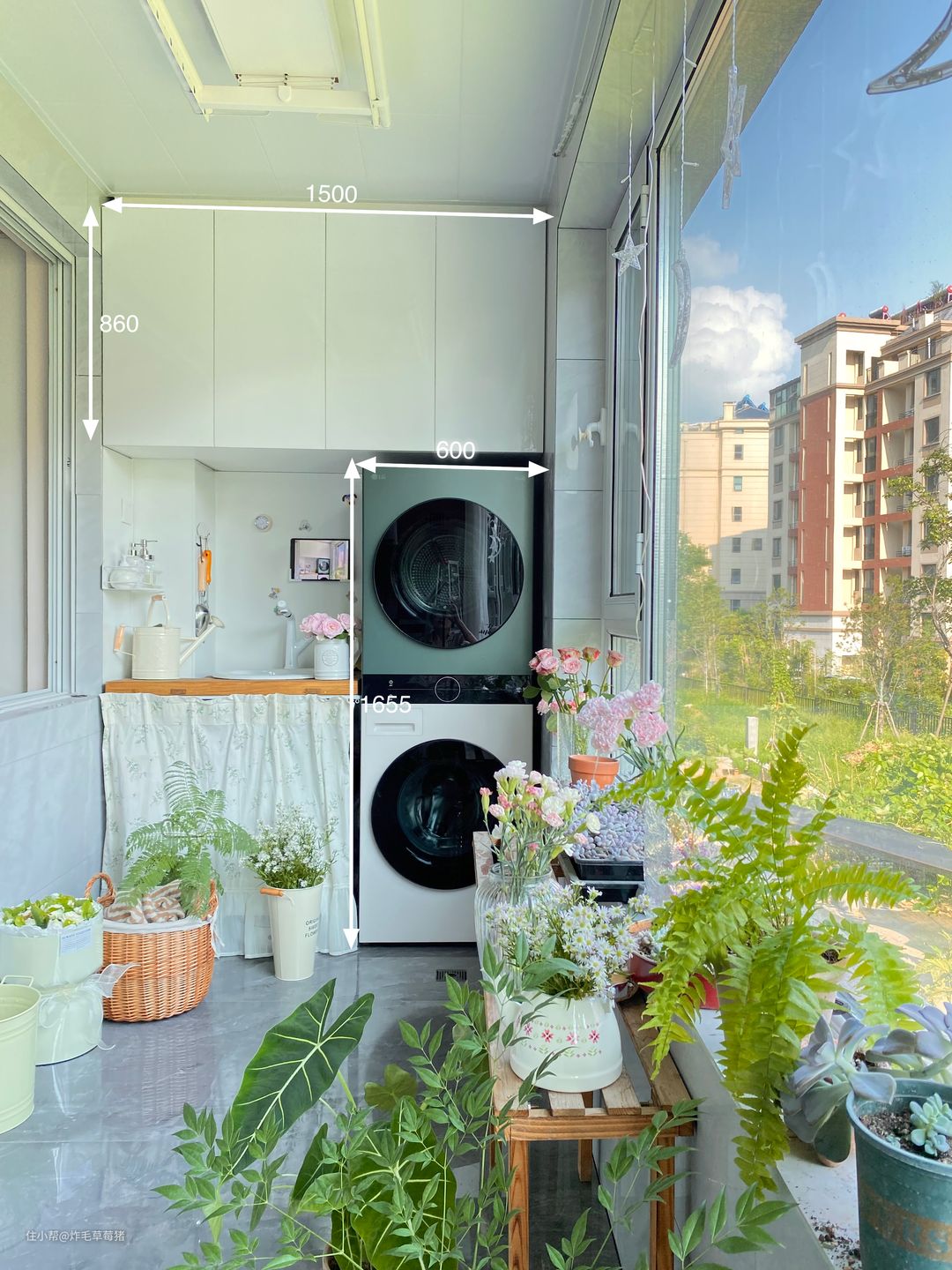 ▫️东边一半为生活区,很满意洗衣机区的设计:几十块做的洗衣机柜、墙面选择了美观又实用的珐琅板、衣服选择交给LG WashTower洗烘塔