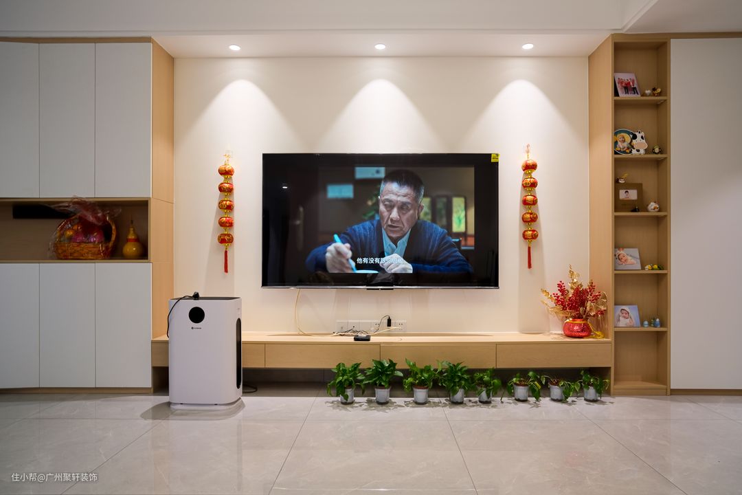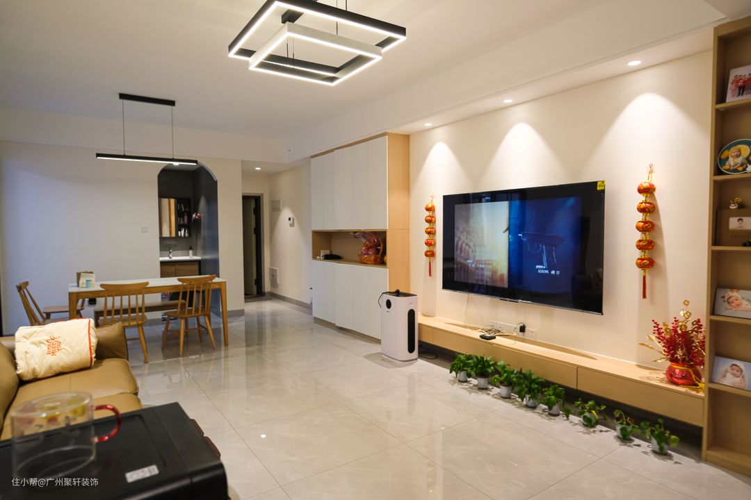 现代简约风客厅,绝对是年轻人的理想之家!广州聚轩装饰2023-08-09整体空间以奶黄色和原木色为基调,自然温馨,温柔又充斥清新感。双眼皮设计的吊顶天花,四周搭配暖光射灯,与下方奶墙面完美呼应,通过柔和光影效果,打造层次感,墙面化身成一幅优美的油画。原先的阳台做封闭设计,将空间纳入客厅,纵向扩大客厅的使用面积,为孩子提供活动空间。
