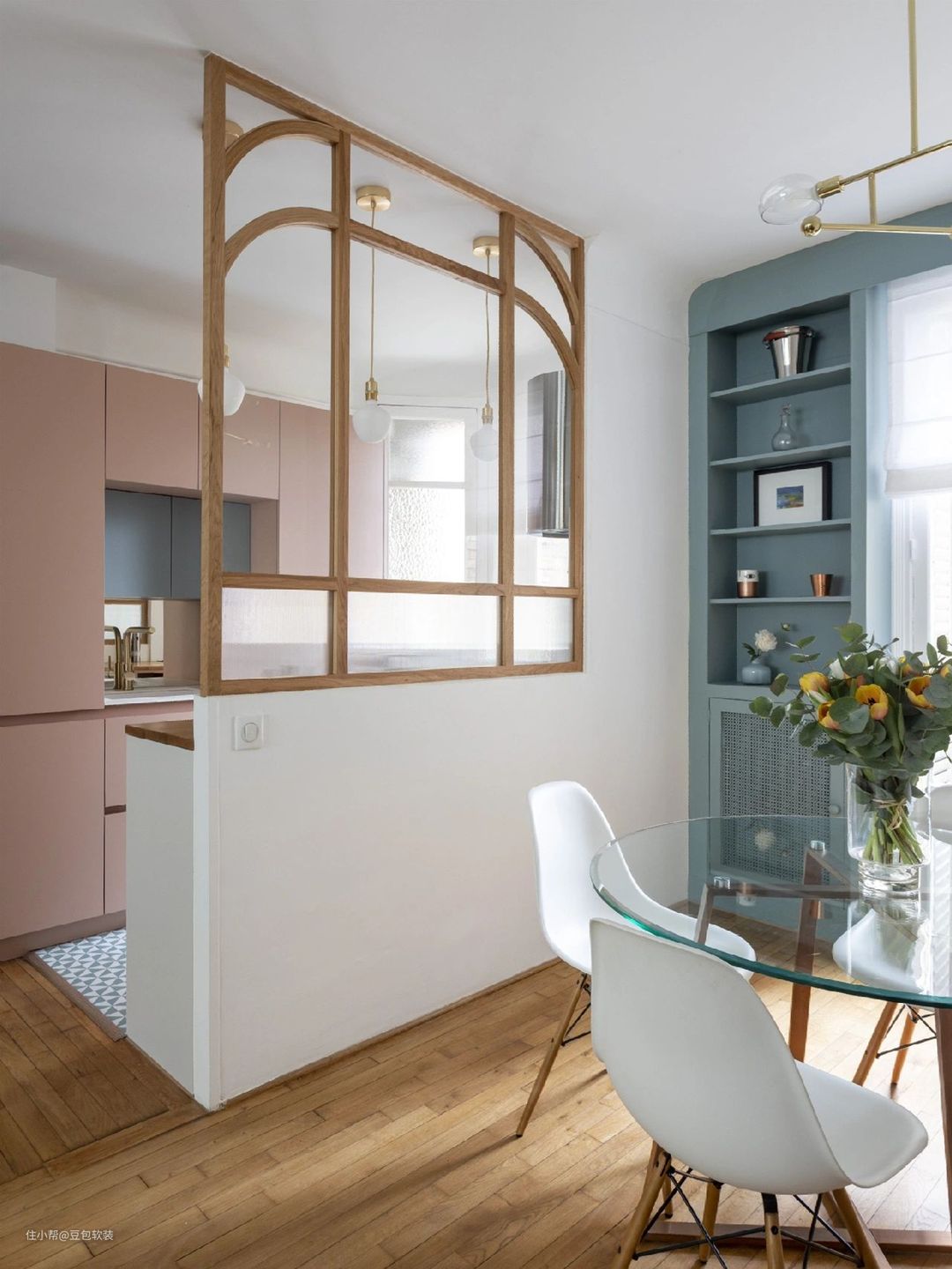 - 不同于传统的隔断,这家将厨房墙面改成半墙玻璃,边角都用木料定制,中间是弧形,简约又通透~🎨