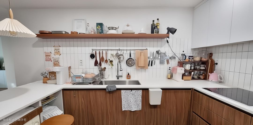 而且厨房做成开放式的,就不能随随便便在墙面上使用开放式的挂钩、轨道和置物架了。所有杂物都必须收进柜子里,这让本就不多的收纳空间更加雪上加霜。