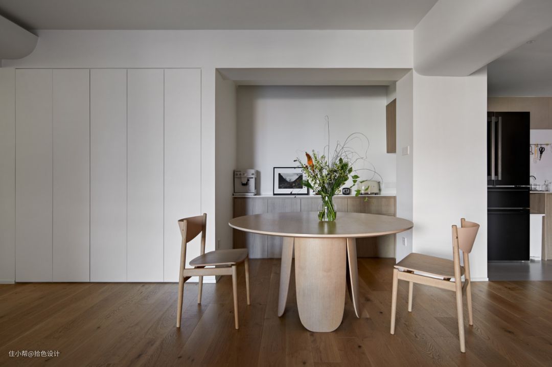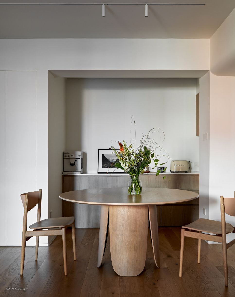 拆掉旁边鸡肋的空间,并量身定制一组餐边柜。一来兼具了部分餐边柜功能,方便日常饮水、冲调。二来也拓展了餐厅的纵深,继而让用餐环境有了足够的松弛。