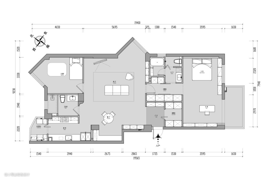 原户型为三定一厅两卫的格局,存在多处结构硬伤。比如入户储物空间不足,且对着卫生间门;比如客厅窗户为异形结构;再比如餐厅旁边有一块鸡肋的空间等。